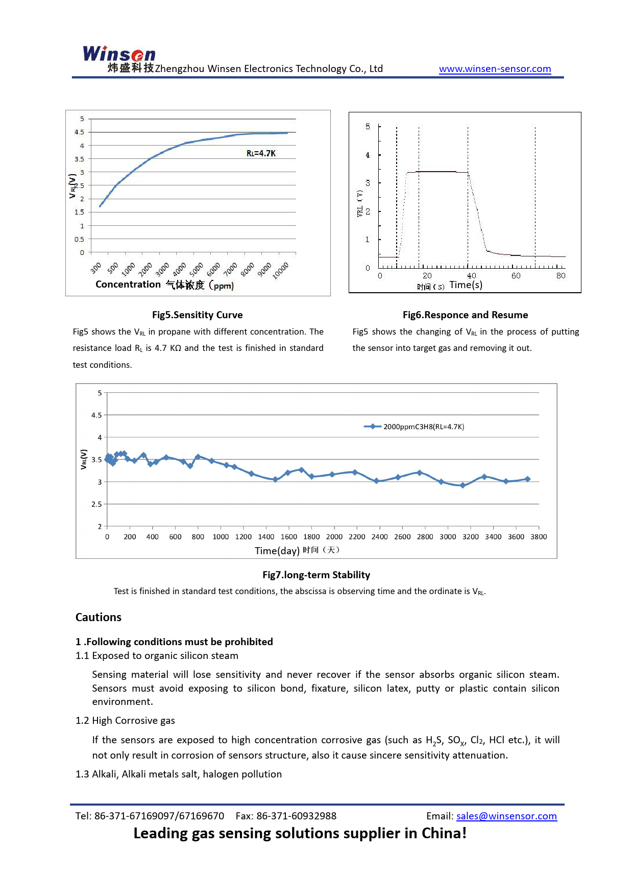 Zhengzhou Winsen Electronics Technology Co., Ltd www.winsen-sensor.com Concentration Time(s) Fig5.Sensitity CurveFig6.Responce and Resume Fig5 shows the VRL in propane with different concentration. The Fig5 shows the changing of VRL in the process of putting resistance load RL is 4.7 KΩ and the test is finished in standard the sensor into target gas and removing it out. test conditions. Time(day) Fig7.long-term Stability Test is finished in standard test conditions, the abscissa is observing time and the ordinate is VRL. Cautions 1 .Fol owing conditions must be prohibited 1.1 Exposed to organic silicon steam Sensing material wil lose sensitivity and never recover if the sensor absorbs organic silicon steam. Sensors must avoid exposing to silicon bond, fixature, silicon latex, putty or plastic contain silicon environment. 1.2 High Corrosive gas If the sensors are exposed to high concentration corrosive gas (such as H2S, SOX, Cl2, HCl etc.), it wil not only result in corrosion of sensors structure, also it cause sincere sensitivity attenuation. 1.3 Alkali, Alkali metals salt, halogen pol ution Tel: 86-371-67169097/67169670 Fax: 86-371-60932988 Email: sales@winsensor.com Leading gas sensing solutions supplier in China! Document Outline Flammable Gas Sensor Instructions: The above fig is the basic test circ Resistance of Sensitive materials (Rs)=(Vc/VRL-1)× Power consumption of Sensitive materials (Ps)=Vc2×