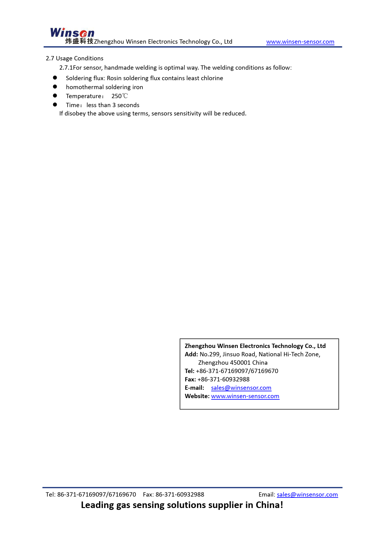 Zhengzhou Winsen Electronics Technology Co., Ltd www.winsen-sensor.com 2.7 Usage Conditions 2.7.1For sensor, handmade welding is optimal way. The welding conditions as fol ow: Soldering flux: Rosin soldering flux contains least chlorine homothermal soldering iron Temperature: 250℃ Time:less than 3 seconds If disobey the above using terms, sensors sensitivity wil be reduced.