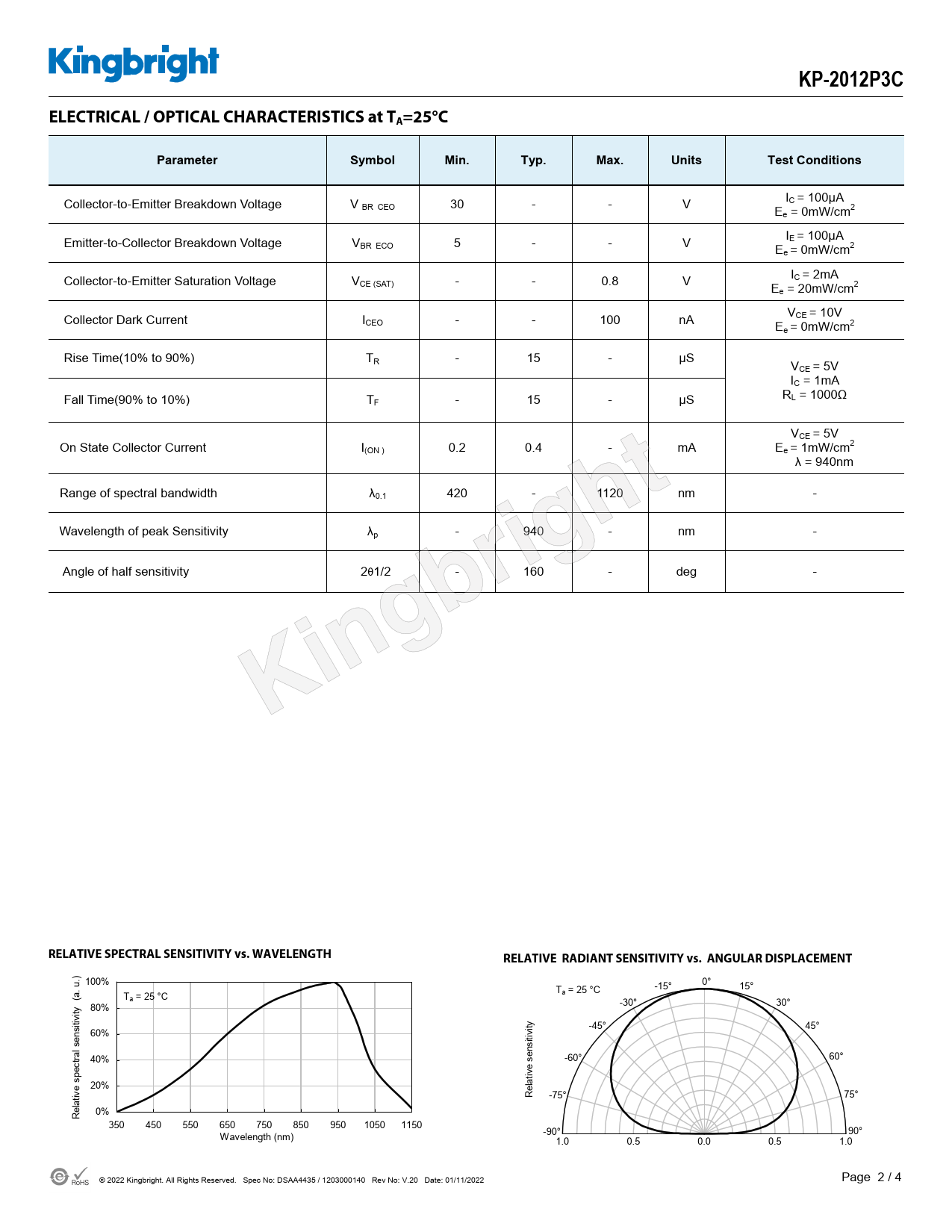 ) 100% 0° -15° 15° Ta = 25 °C a. u. Ta = 25 °C ( -30° 30° 80% itivity -45° 45° 60% ens nsitivity tral s 40% -60° 60° se pec s 20% elative ive R -75° 75° 0% Relat 350 450 550 650 750 850 950 1050 1150 -90° 90° Wavelength (nm) 1.0 0.5 0.0 0.5 1.0 © 2022 Kingbright. All Rights Reserved. Spec No: DSAA4435 / 1203000140 Rev No: V.20 Date: 01/11/2022 Page 2 / 4