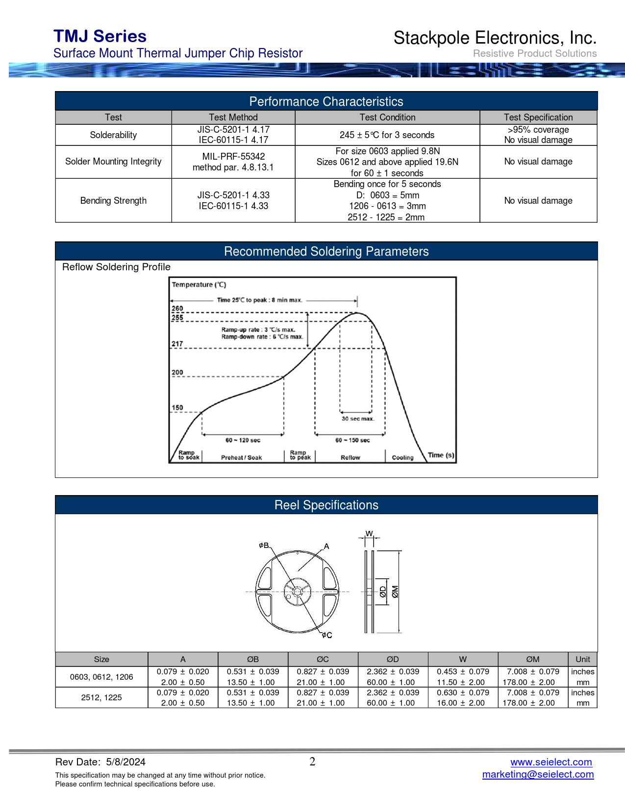 Stackpole Electronics, Inc. Surface Mount Thermal Jumper Chip Resistor Resistive Product Solutions Performance Characteristics Test Test Method Test Condition Test Specification JIS-C-5201-1 4.17 >95% coverage Solderability 245 ± 5°C for 3 seconds IEC-60115-1 4.17 No visual damage For size 0603 applied 9.8N MIL-PRF-55342 Solder Mounting Integrity Sizes 0612 and above applied 19.6N N o vi su a l d a m a ge method par. 4.8.13.1 for 60 ± 1 seconds Bending once for 5 seconds JIS-C-5201-1 4.33 D: 0603 = 5mm Bending Strength No visual damage IEC-60115-1 4.33 1206 - 0613 = 3mm 2512 - 1225 = 2mm Recommended Soldering Parameters Reflow Soldering Profile Reel Specifications Size A ØB ØC ØD W ØM Unit 0.079 ± 0.020 0.531 ± 0.039 0.827 ± 0.039 2.362 ± 0.039 0.453 ± 0.079 7.008 ± 0.079 inches 0603, 0612, 1206 2.00 ± 0.50 13.50 ± 1.00 21.00 ± 1.00 60.00 ± 1.00 11.50 ± 2.00 178.00 ± 2.00 mm 0.079 ± 0.020 0.531 ± 0.039 0.827 ± 0.039 2.362 ± 0.039 0.630 ± 0.079 7.008 ± 0.079 inches 2512, 1225 2.00 ± 0.50 13.50 ± 1.00 21.00 ± 1.00 60.00 ± 1.00 16.00 ± 2.00 178.00 ± 2.00 mm Rev Date: 5/8/2024 2 www.seielect.com This specification may be changed at any time without prior notice. marketing@seielect.com Please confirm technical specifications before use.