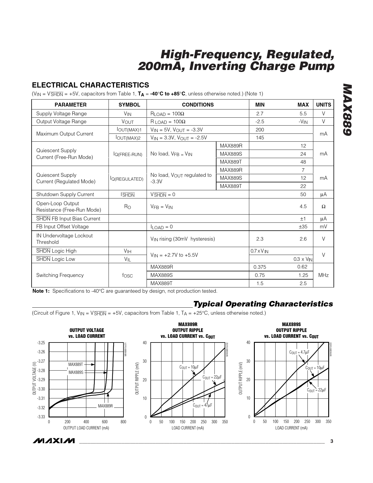 High-Frequency, Regulated,. 200mA, Inverting Charge Pump. MAX889. ELECTRICAL CHARACTERISTICS. -40. C to +85. PARAMETER. SYMBOL