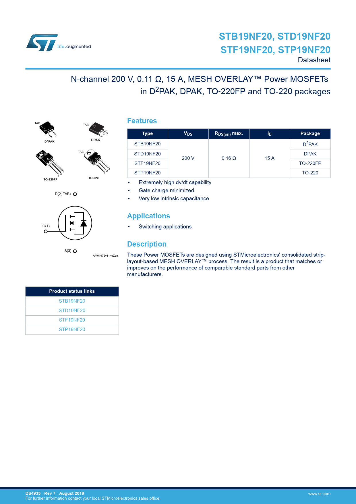 STB19NF20, STD19NF20STF19NF20, STP19NF20 Datasheet N-channel 200 V, 0.11 Ω, 15 A, MESH OVERLAY™ Power MOSFETs in D2PAK, DPAK, TO‑220FP and TO-220 packages Features TAB TAB 2 3 TypeV 3 DSRDS(on) max.IDPackage 1 1 D P2 AKDPAK STB19NF20 D2PAK TAB STD19NF20 DPAK 200 V 0.16 Ω 15 A STF19NF20 TO-220FP 3 3 2 1 2 STP19NF20 TO-220 1 TO-220TO-220FP • Extremely high dv/dt capability • Gate charge minimized D(2, TAB) • Very low intrinsic capacitance Applications G(1) • Switching applications Description S(3) AM01475v1_noZen These Power MOSFETs are designed using STMicroelectronics' consolidated strip- layout-based MESH OVERLAY™ process. The result is a product that matches or improves on the performance of comparable standard parts from other manufacturers. Product status links STB19NF20 STD19NF20 STF19NF20 STP19NF20 DS4935 - Rev 7 - August 2018 www.st.com For further information contact your local STMicroelectronics sales office. Document Outline 1 Electrical ratings 2 Electrical characteristics 2.1 Electrical characteristics (curves) 3 Test circuits 4 Ordering information 5 Package information 5.1 D²PAK (TO-263) type A package information 5.2 D²PAK (TO-263) type B package information 5.3 DPAK (TO-252) type A2 package information 5.4 DPAK (TO-252) type C2 package information 5.5 D²PAK and DPAK packing information 5.6 TO-220FP package information 5.7 TO-220 type A package information Revision history