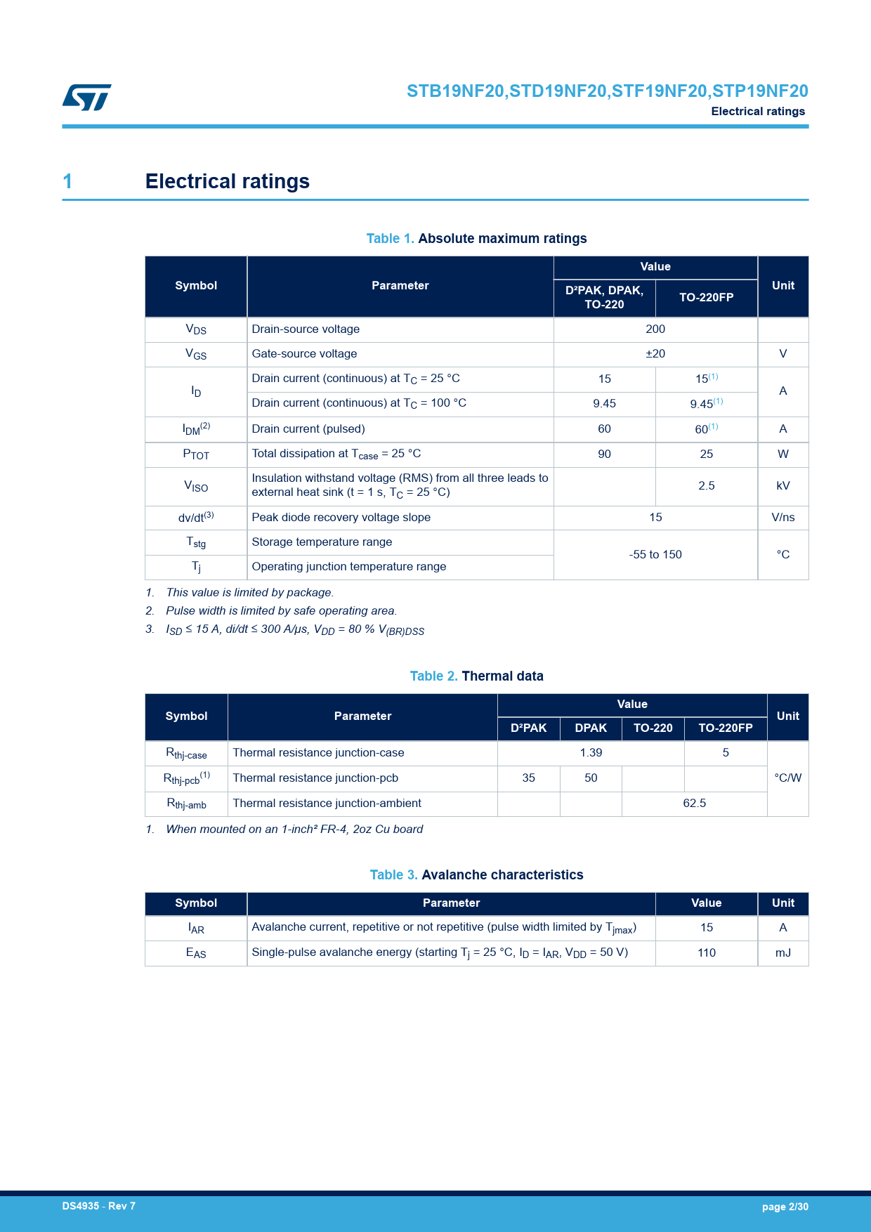 link to page 2 link to page 2 link to page 2 link to page 2 link to page 2 link to page 2 STB19NF20,STD19NF20,STF19NF20,STP19NF20Electrical ratings1Electrical ratingsTable 1. Absolute maximum ratingsValueSymbolParameterUnitD²PAK, DPAK,TO-220FPTO-220 VDS Drain-source voltage 200 VGS Gate-source voltage ±20 V Drain current (continuous) at TC = 25 °C 15 15(1) ID A Drain current (continuous) at TC = 100 °C 9.45 9.45(1) I (2) DM Drain current (pulsed) 60 60(1) A PTOT Total dissipation at Tcase = 25 °C 90 25 W Insulation withstand voltage (RMS) from all three leads to VISO external heat sink (t = 1 s, TC = 25 °C) 2.5 kV dv/dt(3) Peak diode recovery voltage slope 15 V/ns Tstg Storage temperature range -55 to 150 °C Tj Operating junction temperature range 1. This value is limited by package. 2. Pulse width is limited by safe operating area. 3. ISD ≤ 15 A, di/dt ≤ 300 A/μs, VDD = 80 % V(BR)DSS Table 2. Thermal dataValueSymbolParameterUnitD²PAKDPAKTO-220TO-220FP Rthj-case Thermal resistance junction-case 1.39 5 R (1) thj-pcb Thermal resistance junction-pcb 35 50 °C/W Rthj-amb Thermal resistance junction-ambient 62.5 1. When mounted on an 1-inch² FR-4, 2oz Cu board Table 3. Avalanche characteristicsSymbolParameterValueUnit IAR Avalanche current, repetitive or not repetitive (pulse width limited by Tjmax) 15 A EAS Single-pulse avalanche energy (starting Tj = 25 °C, ID = IAR, VDD = 50 V) 110 mJ DS4935 - Rev 7page 2/30 Document Outline 1 Electrical ratings 2 Electrical characteristics 2.1 Electrical characteristics (curves) 3 Test circuits 4 Ordering information 5 Package information 5.1 D²PAK (TO-263) type A package information 5.2 D²PAK (TO-263) type B package information 5.3 DPAK (TO-252) type A2 package information 5.4 DPAK (TO-252) type C2 package information 5.5 D²PAK and DPAK packing information 5.6 TO-220FP package information 5.7 TO-220 type A package information Revision history