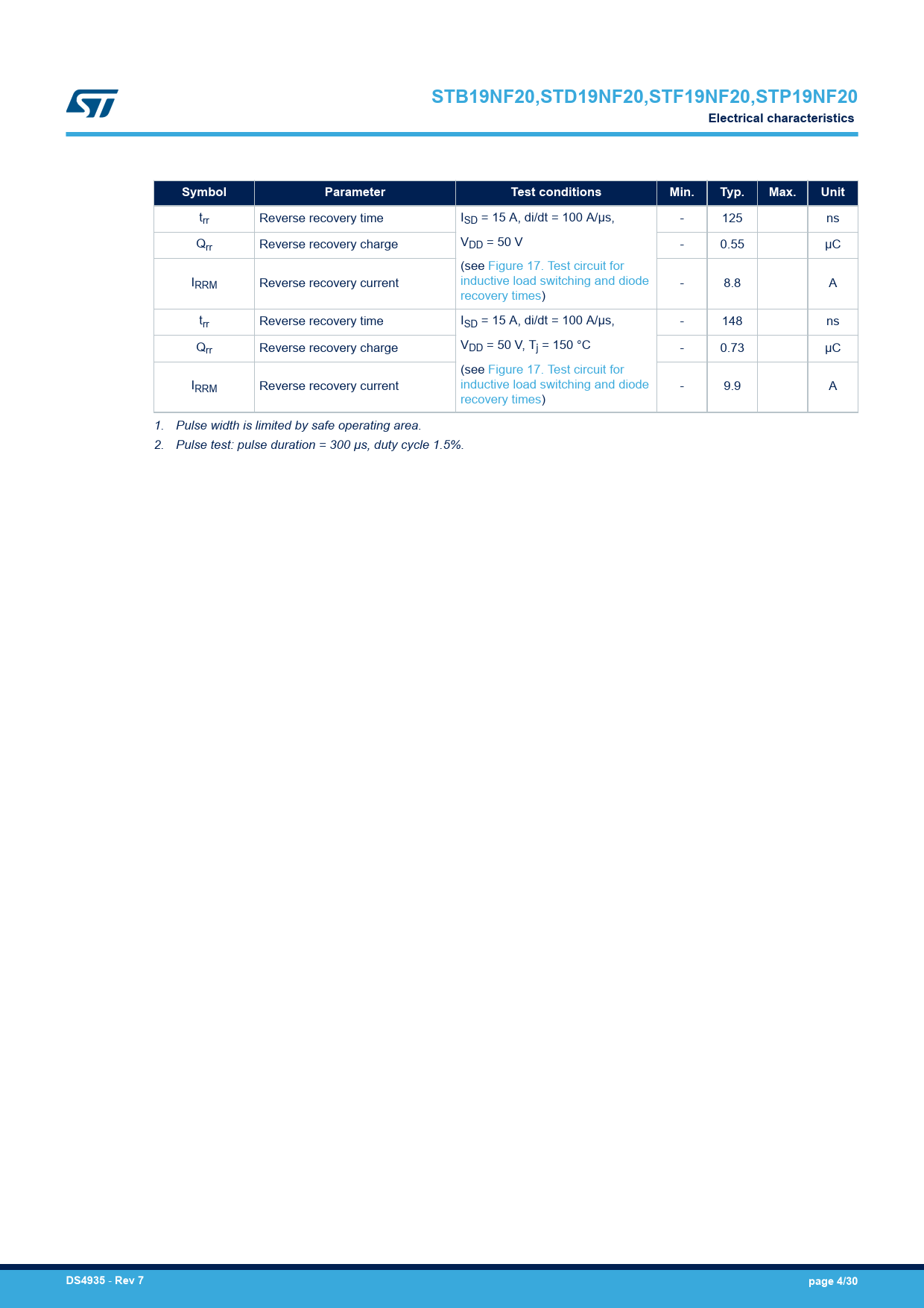 trr Reverse recovery time ISD = 15 A, di/dt = 100 A/µs, - 125 ns Q V rr Reverse recovery charge DD = 50 V - 0.55 µC (see Figure 17. Test circuit for I inductive load switching and diode RRM Reverse recovery current - 8.8 A recovery times) trr Reverse recovery time ISD = 15 A, di/dt = 100 A/µs, - 148 ns Q V rr Reverse recovery charge DD = 50 V, Tj = 150 °C - 0.73 µC (see Figure 17. Test circuit for I inductive load switching and diode RRM Reverse recovery current - 9.9 A recovery times) 1. Pulse width is limited by safe operating area. 2. Pulse test: pulse duration = 300 µs, duty cycle 1.5%.