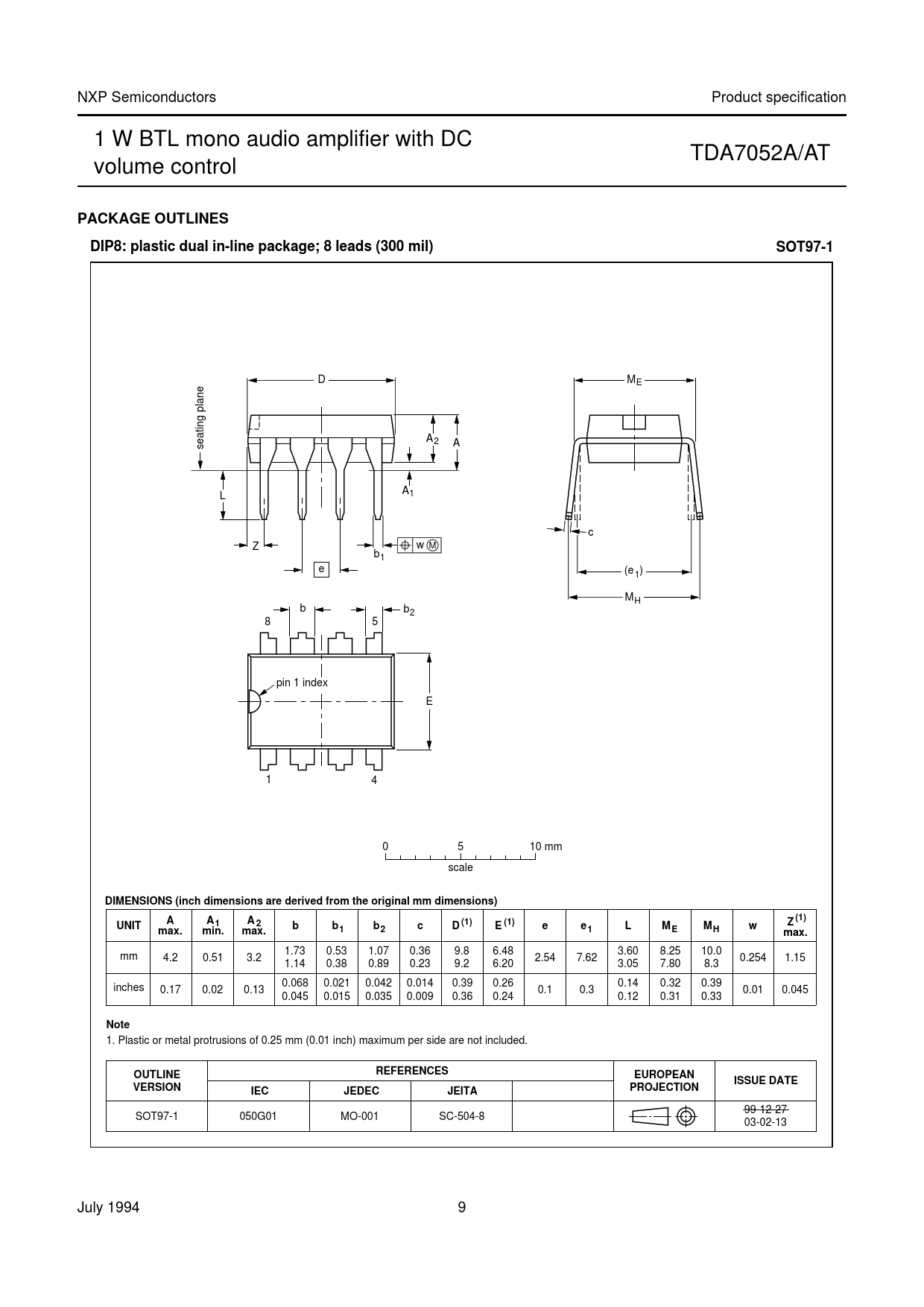 PACKAGE OUTLINES. DIP8: plastic dual in-line package; 8 leads (300 mil). SOT97-1
