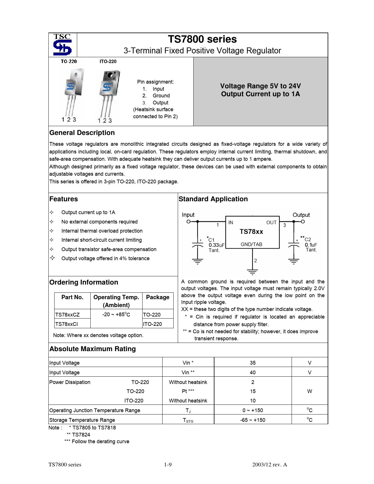 TS7800 series 3-Terminal Fixed Positive Voltage Regulator ITO-220 Pin assignment: 1. Input Voltage Range 5V to 24V 2. Ground Output Current up to 1A 3. Output (Heatsink surface connected to Pin 2) General Description These voltage regulators are monolithic integrated circuits designed as fixed-voltage regulators for a wide variety of applications including local, on-card regulation. These regulators employ internal current limiting, thermal shutdown, and safe-area compensation. With adequate heatsink they can deliver output currents up to 1 ampere. Although designed primarily as a fixed voltage regulator, these devices can be used with external components to obtain adjustable voltages and currents. This series is offered in 3-pin TO-220, ITO-220 package. FeaturesStandard Application Output current up to 1A No external components required Internal thermal overload protection Internal short-circuit current limiting Output transistor safe-area compensation Output voltage offered in 4% tolerance Ordering Information A common ground is required between the input and the output voltages. The input voltage must remain typically 2.0V Part No.Operating Temp.Package above the output voltage even during the low point on the Input ripple voltage. (Ambient) XX = these two digits of the type number indicate voltage. TS78xxCZ T -20 ~ +85oC O-220 * = Cin is required if regulator is located an appreciable TS78xxCI ITO-220 distance from power supply filter. ** = Co is not needed for stability; however, it does improve Note: Where xx denotes voltage option. transient response. Absolute Maximum Rating Input Voltage Vin * 35 V Input Voltage Vin ** 40 V Power Dissipation TO-220 Without heatsink 2 TO-220 Pt *** 15 W ITO-220 Without heatsink 10 Operating Junction Temperature Range TJ 0 ~ +150 oC Storage Temperature Range TSTG -65 ~ +150 oC Note : * TS7805 to TS7818 ** TS7824 *** Follow the derating curve TS7800 series 1-9 2003/12 rev. A
