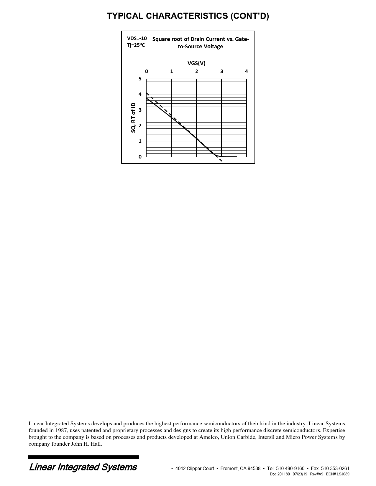 TYPICAL CHARACTERISTICS (CONT’D) Linear Integrated Systems develops and produces the highest performance semiconductors of their kind in the industry. Linear Systems, founded in 1987, uses patented and proprietary processes and designs to create its high performance discrete semiconductors. Expertise brought to the company is based on processes and products developed at Amelco, Union Carbide, Intersil and Micro Power Systems by company founder John H. Hall. Linear Integrated Systems • 4042 Clipper Court • Fremont, CA 94538 • Tel: 510 490-9160 • Fax: 510 353-0261 Doc 201180 07/23/19 Rev#A9 ECN# LSJ689