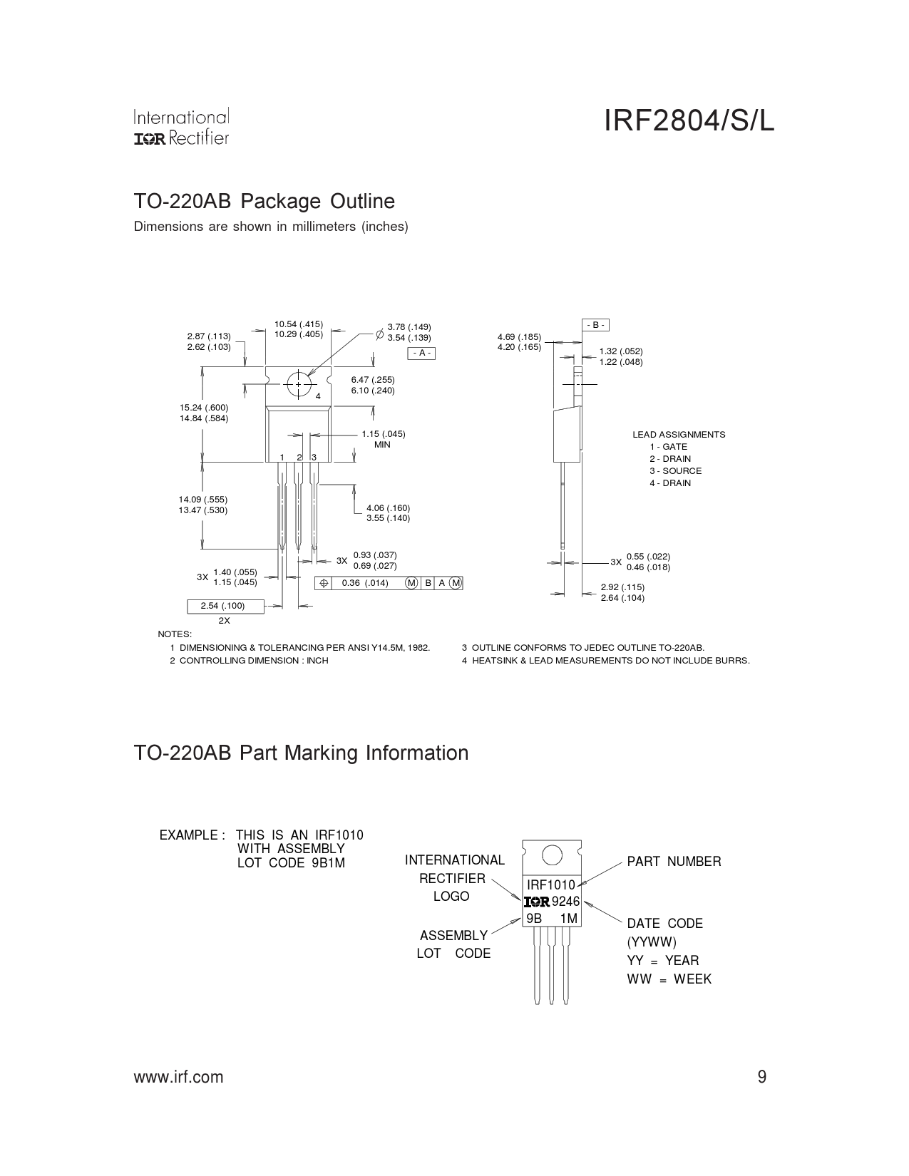 IRF2804/S/L TO-220AB Package Outline Dimensions are shown in millimeters (inches) 10.54 (.415) - B - 3.78 (.149) 10.29 (.405) 2.87 (.113) 3.54 (.139) 4.69 (.185) 2.62 (.103) 4.20 (.165) - A - 1.32 (.052) 1.22 (.048) 6.47 (.255) 6.10 (.240) 4 15.24 (.600) 14.84 (.584) 1.15 (.045) LEAD ASSIGNMENTS MIN 1 - GATE 1 2 3 2 - DRAIN 3 - SOURCE 4 - DRAIN 14.09 (.555) 4.06 (.160) 13.47 (.530) 3.55 (.140) 0.93 (.037) 0.55 (.022) 3X 3X 0.69 (.027) 0.46 (.018) 1.40 (.055) 3X 1.15 (.045) 0.36 (.014) M B A M 2.92 (.115) 2.64 (.104) 2.54 (.100) 2X NOTES: 1 DIMENSIONING & TOLERANCING PER ANSI Y14.5M, 1982. 3 OUTLINE CONFORMS TO JEDEC OUTLINE TO-220AB. 2 CONTROLLING DIMENSION : INCH 4 HEATSINK & LEAD MEASUREMENTS DO NOT INCLUDE BURRS. TO-220AB Part Marking Information EXAMPLE : THIS IS AN IRF1010 WITH ASSEMBLY A INTERNATIONAL LOT CODE 9B1M PART NUMBER RECTIFIER IRF1010 LOGO 9246 9B 1M DATE CODE ASSEMBLY (YYWW) LOT CODE YY = YEAR WW = WEEK www.irf.com 9