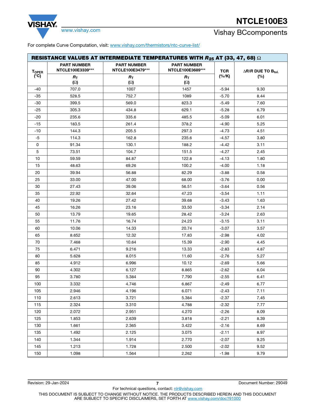 www.vishay.com Vishay BCcomponents For complete Curve Computation, visit: www.vishay.com/thermistors/ntc-curve-list/