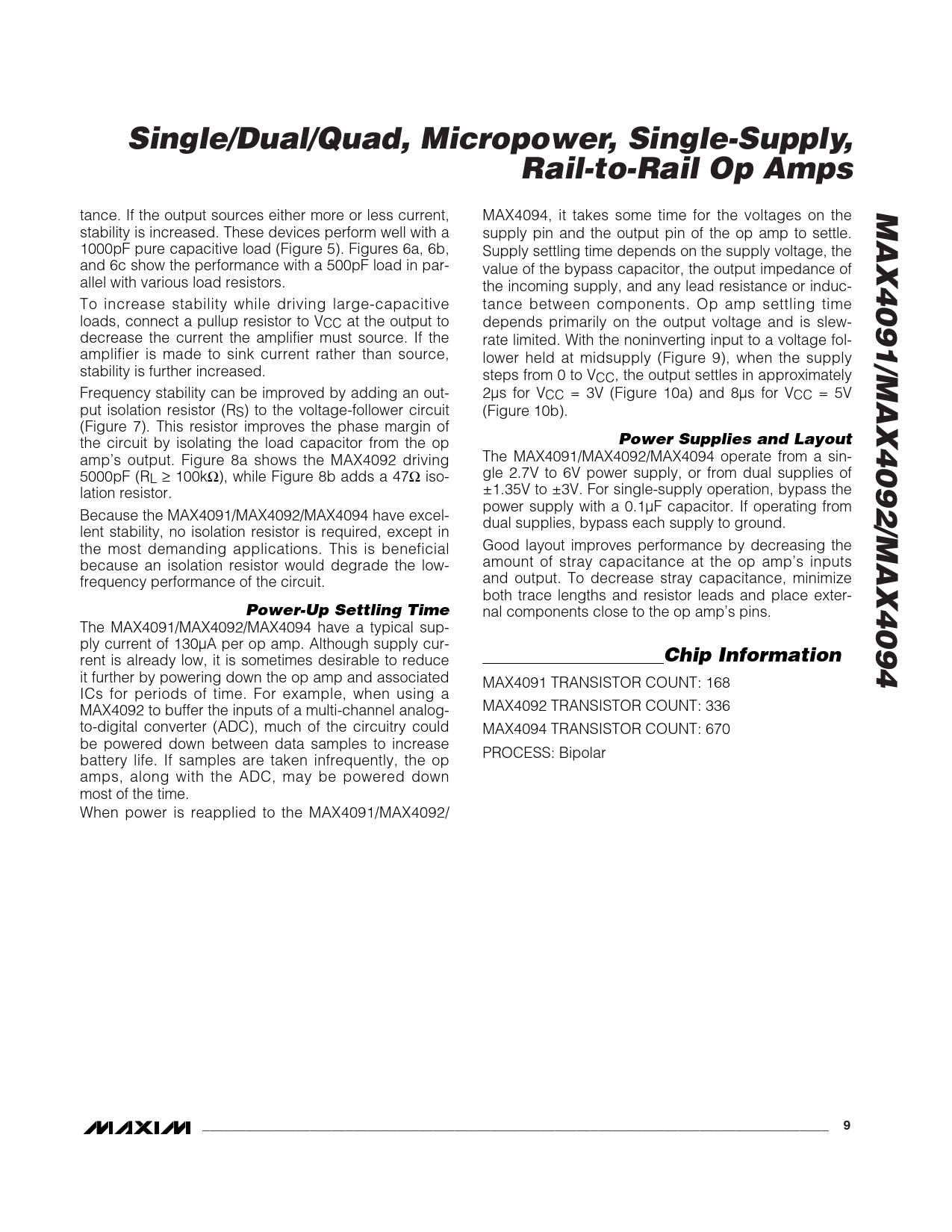 Single/Dual/Quad, Micropower, Single-Supply,Rail-to-Rail Op AmpsMAX4091/MAX4092/MAX4094 tance. If the output sources either more or less current, MAX4094, it takes some time for the voltages on the stability is increased. These devices perform well with a supply pin and the output pin of the op amp to settle. 1000pF pure capacitive load (Figure 5). Figures 6a, 6b, Supply settling time depends on the supply voltage, the and 6c show the performance with a 500pF load in par- value of the bypass capacitor, the output impedance of allel with various load resistors. the incoming supply, and any lead resistance or induc- To increase stability while driving large-capacitive tance between components. Op amp settling time loads, connect a pullup resistor to VCC at the output to depends primarily on the output voltage and is slew- decrease the current the amplifier must source. If the rate limited. With the noninverting input to a voltage fol- amplifier is made to sink current rather than source, lower held at midsupply (Figure 9), when the supply stability is further increased. steps from 0 to VCC, the output settles in approximately Frequency stability can be improved by adding an out- 2µs for VCC = 3V (Figure 10a) and 8µs for VCC = 5V put isolation resistor (RS) to the voltage-follower circuit (Figure 10b). (Figure 7). This resistor improves the phase margin of the circuit by isolating the load capacitor from the op Power Supplies and Layout amp’s output. Figure 8a shows the MAX4092 driving The MAX4091/MAX4092/MAX4094 operate from a sin- 5000pF (RL ≥ 100kΩ), while Figure 8b adds a 47Ω iso- gle 2.7V to 6V power supply, or from dual supplies of lation resistor. ±1.35V to ±3V. For single-supply operation, bypass the power supply with a 0.1µF capacitor. If operating from Because the MAX4091/MAX4092/MAX4094 have excel- dual supplies, bypass each supply to ground. lent stability, no isolation resistor is required, except in the most demanding applications. This is beneficial Good layout improves performance by decreasing the because an isolation resistor would degrade the low- amount of stray capacitance at the op amp’s inputs frequency performance of the circuit. and output. To decrease stray capacitance, minimize both trace lengths and resistor leads and place exter- Power-Up Settling Time nal components close to the op amp’s pins. The MAX4091/MAX4092/MAX4094 have a typical sup- ply current of 130µA per op amp. Although supply cur- rent is already low, it is sometimes desirable to reduce Chip Information it further by powering down the op amp and associated MAX4091 TRANSISTOR COUNT: 168 ICs for periods of time. For example, when using a MAX4092 to buffer the inputs of a multi-channel analog- MAX4092 TRANSISTOR COUNT: 336 to-digital converter (ADC), much of the circuitry could MAX4094 TRANSISTOR COUNT: 670 be powered down between data samples to increase PROCESS: Bipolar battery life. If samples are taken infrequently, the op amps, along with the ADC, may be powered down most of the time. When power is reapplied to the MAX4091/MAX4092/ _______________________________________________________________________________________9