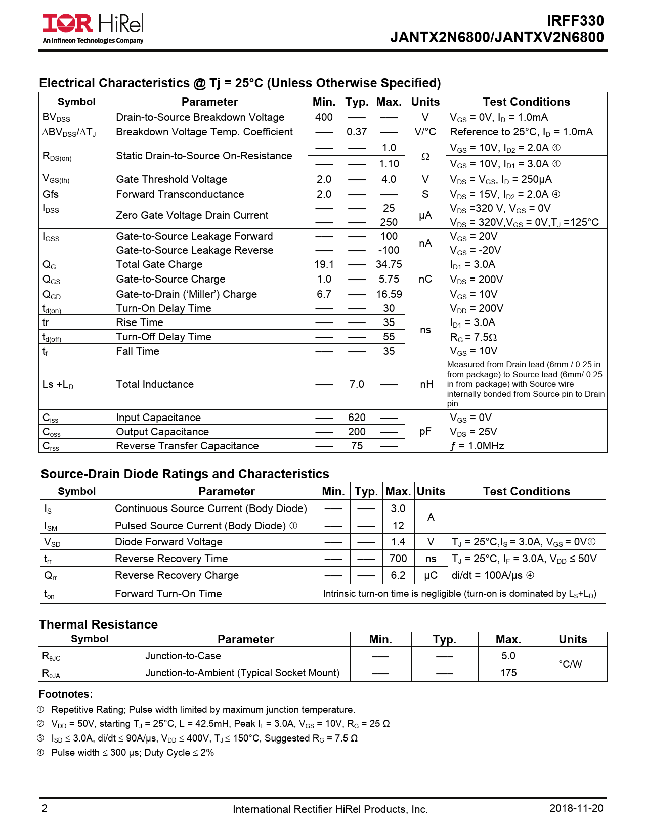 Datasheet IRFF330, JANTX2N6800, JANTXV2N6800 (Infineon) - 2