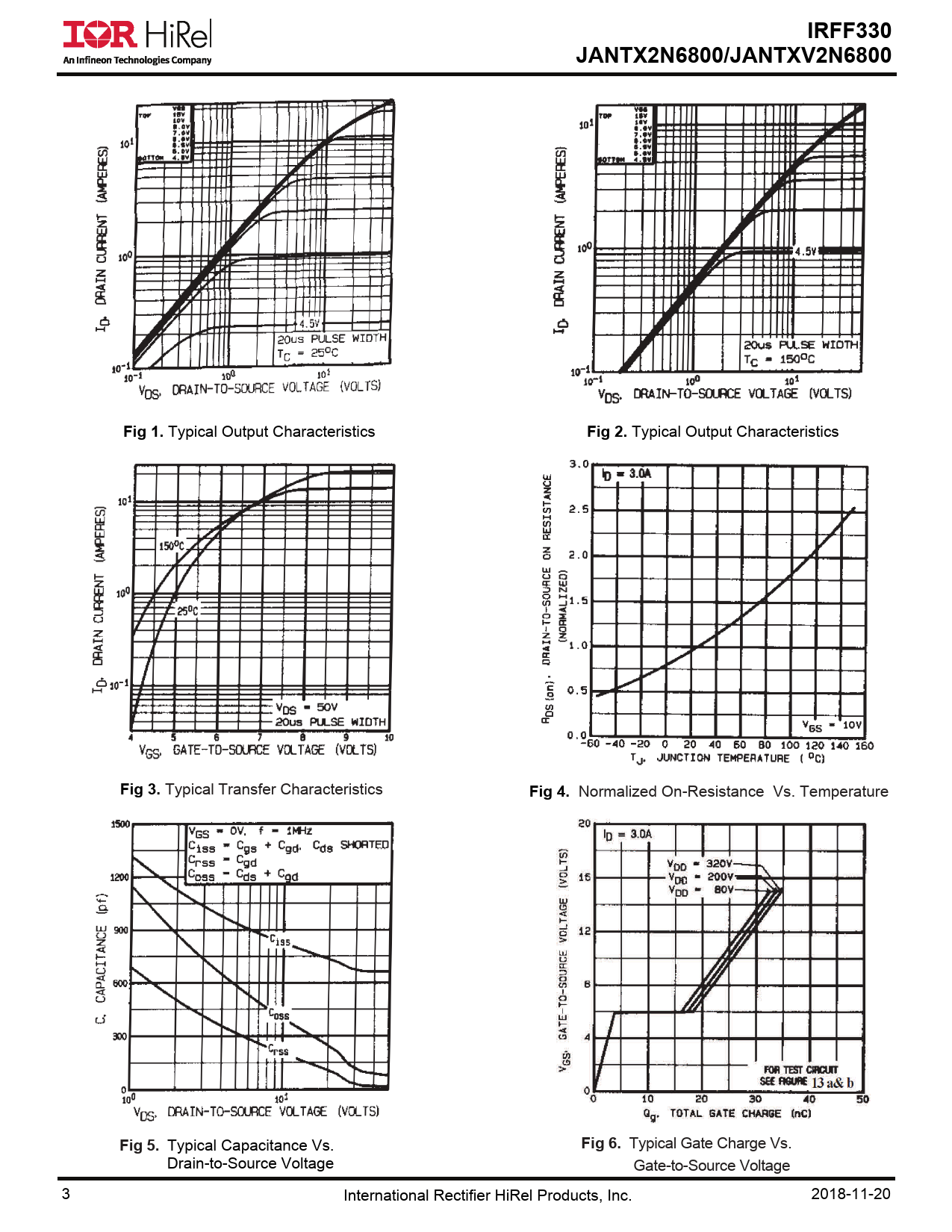 IRFF330JANTX2N6800/JANTXV2N6800Fig 1. Typical Output Characteristics Fig 2. Typical Output Characteristics Fig 3. Typical Transfer Characteristics Fig 4. Normalized On-Resistance Vs. Temperature Fig 5. Typical Capacitance Vs. Fig 6. Typical Gate Charge Vs. Drain-to-Source Voltage Gate-to-Source Voltage 3 International Rectifier HiRel Products, Inc. 2018-11-20