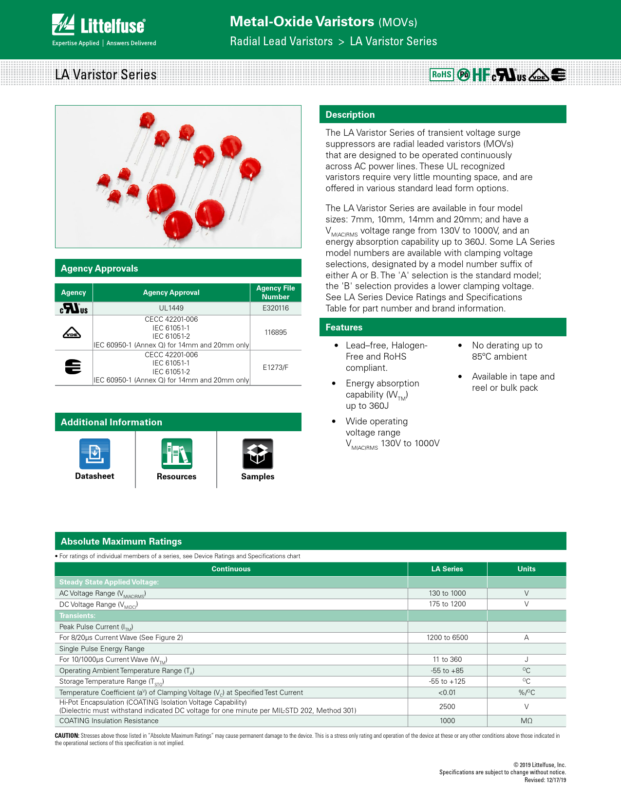Metal-Oxide Varistors. RoHS. Description. Agency Approvals. Agency File. Agency. Agency Approval. Number. Features