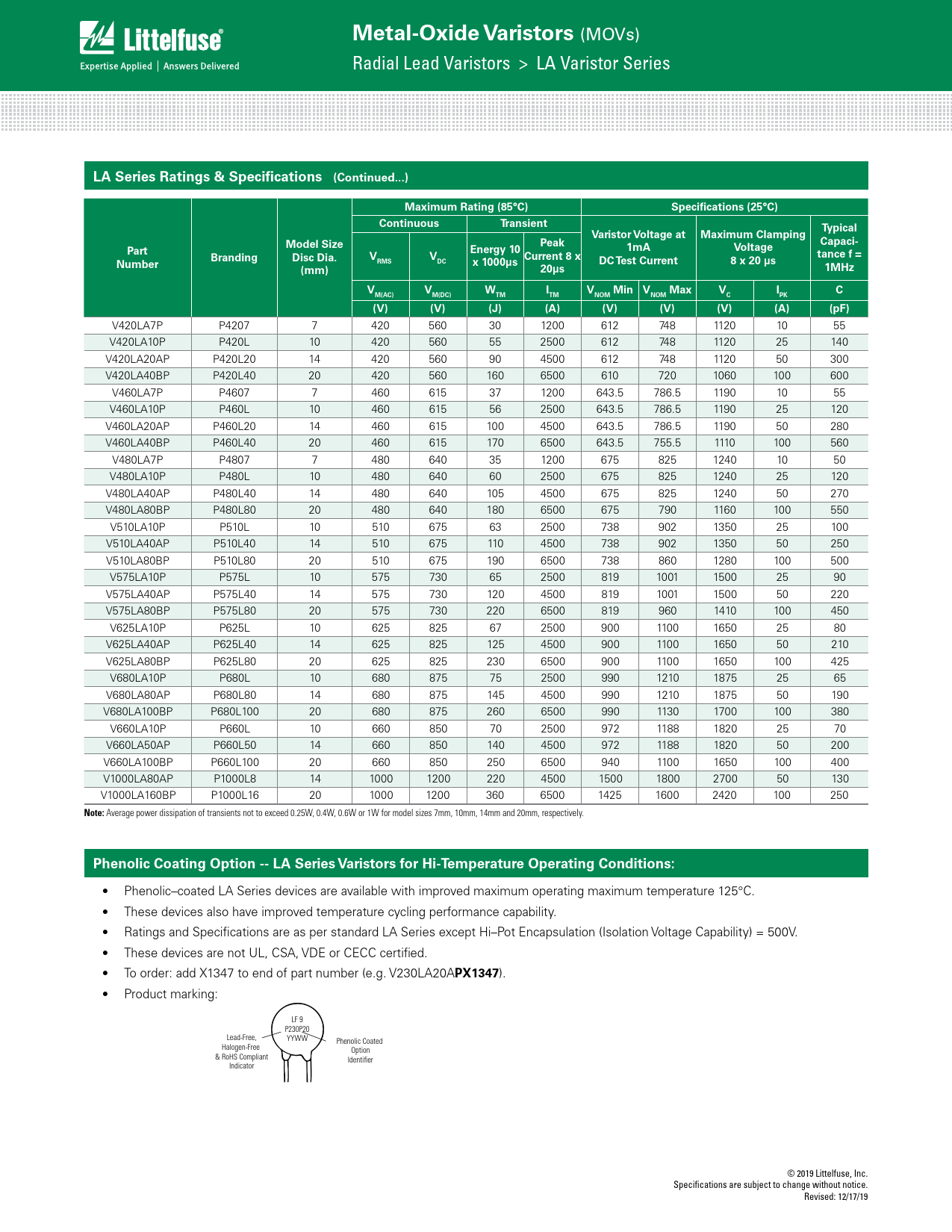 • Phenolic–coated LA Series devices are available with improved maximum operating maximum temperature 125°C. • These devices also have improved temperature cycling performance capability. • Ratings and Specifications are as per standard LA Series except Hi–Pot Encapsulation (Isolation Voltage Capability) = 500V. • These devices are not UL, CSA, VDE or CECC certified. • To order: add X1347 to end of part number (e.g. V230LA20A