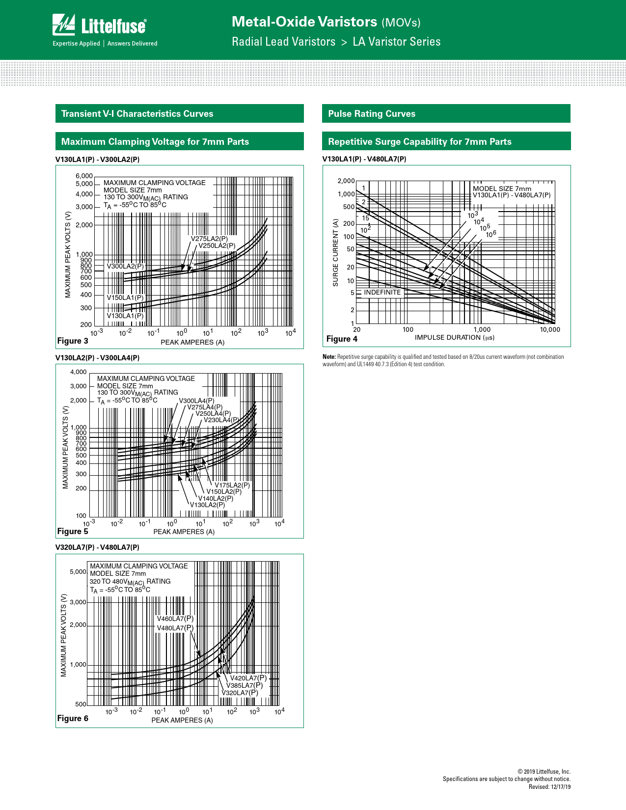 Transient V-I Characteristics Curves Pulse Rating Curves Maximum Clamping Voltage for 7mm Parts Repetitive Surge Capability for 7mm Parts Transient V130LA1(P) - V30 V-I Char 0LA2(P) acteristics Curves V130LA1(P) - V480LA7(P)