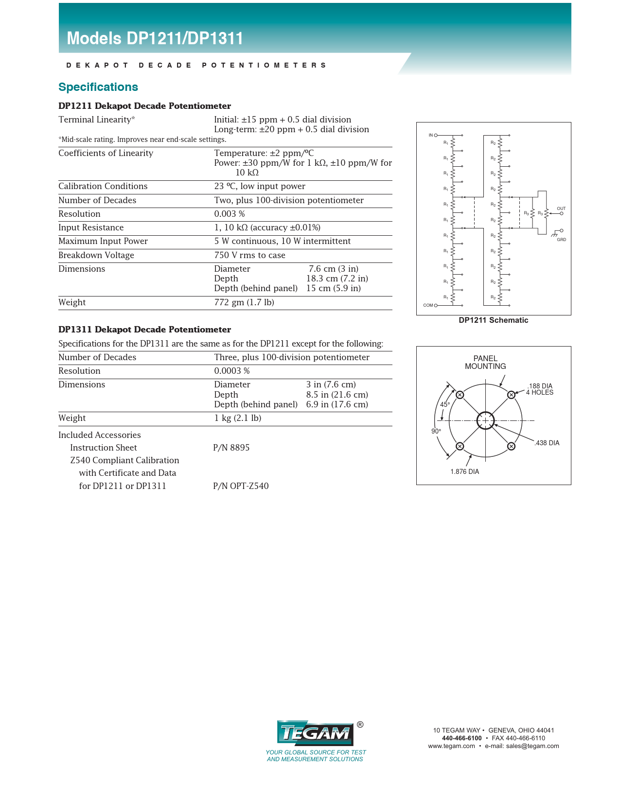 Specifications for the DP1311 are the same as for the DP1211 except for the following: Number of Decades Three, plus 100-division potentiometer PANEL Resolution 0.0003 % MOUNTING Dimensions Diameter 3 in (7.6 cm) .188 DIA Depth 8.5 in (21.6 cm) 4 HOLES Depth (behind panel) 6.9 in (17.6 cm) 45° Weight 1 kg (2.1 lb) Included Accessories 90° Instruction Sheet P/N 8895 .438 DIA Z540 Compliant Calibration with Certificate and Data 1.876 DIA for DP1211 or DP1311 P/N OPT-Z540 ® 10 TEGAM WAY • GENEVA, OHIO 44041
