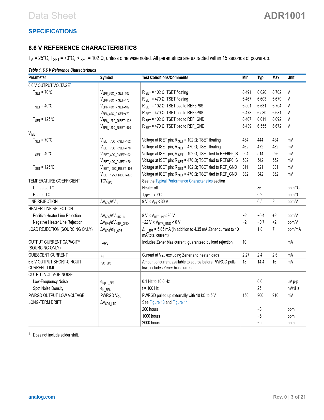 ADR1001 SPECIFICATIONS 6.6 V REFERENCE CHARACTERISTICS Table 1 6.6 V Reference Characteristics Parameter Symbol