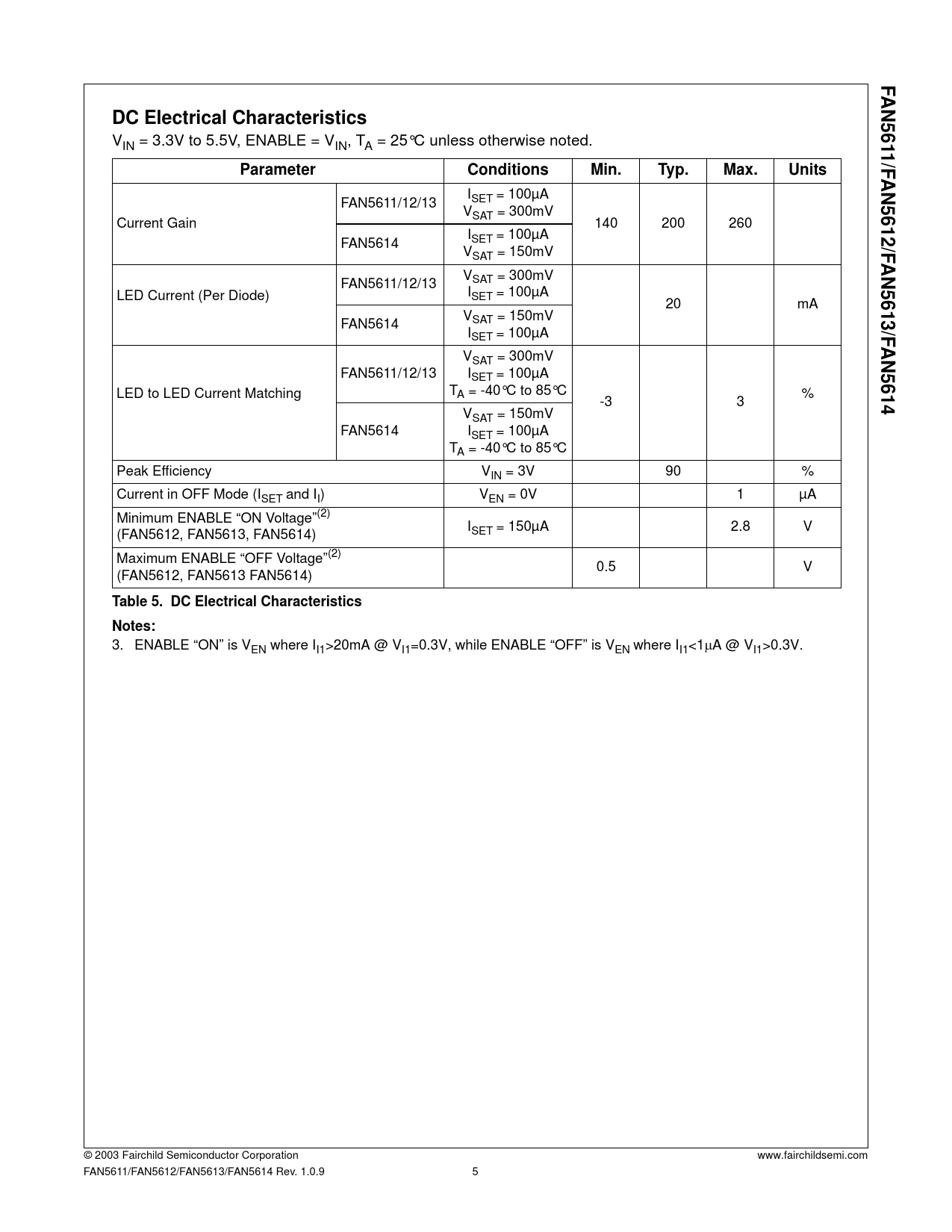 3. ENABLE “ON” is VEN where II1>20mA @ VI1=0.3V, while ENABLE “OFF” is VEN where II1<1μA @ VI1>0.3V. © 2003 Fairchild Semiconductor Corporation www.fairchildsemi.com FAN5611/FAN5612/FAN5613/FAN5614 Rev. 1.0.9 5