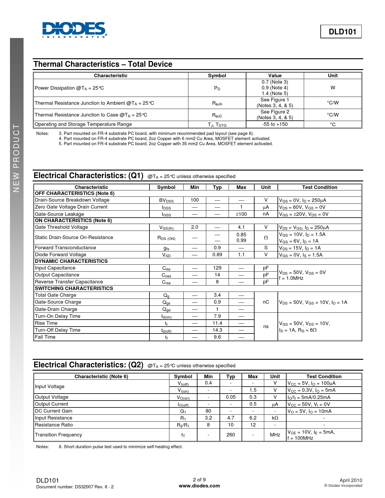 DLD101. Thermal Characteristics – Total Device. Characteristic Symbol. Value. Unit. Electrical Characteristics: (Q1). Min. Typ. Max. Test