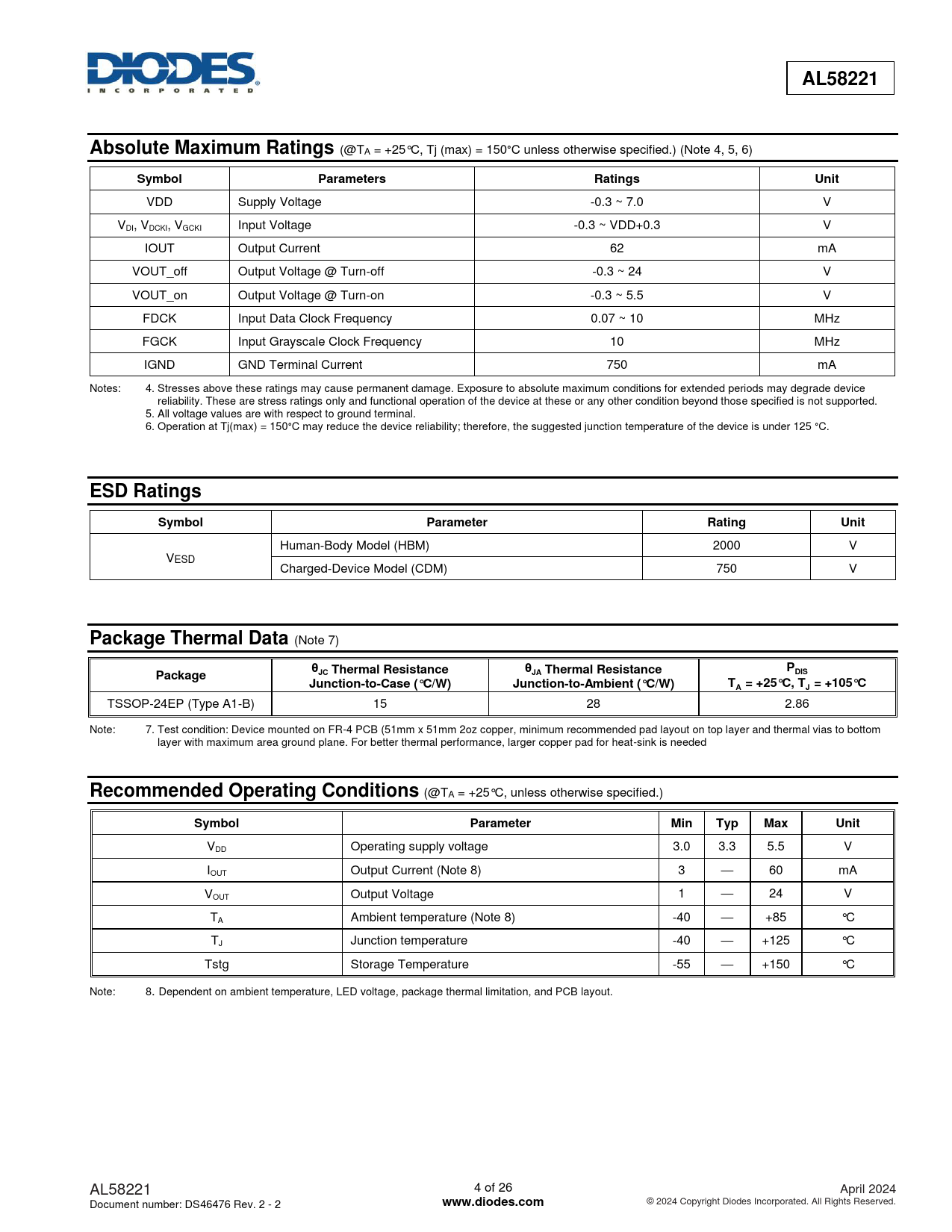 AL58221. Absolute Maximum Ratings. Symbol. Parameters. Ratings. Unit. ESD Ratings. Parameter. Rating. Package Thermal Data. Package