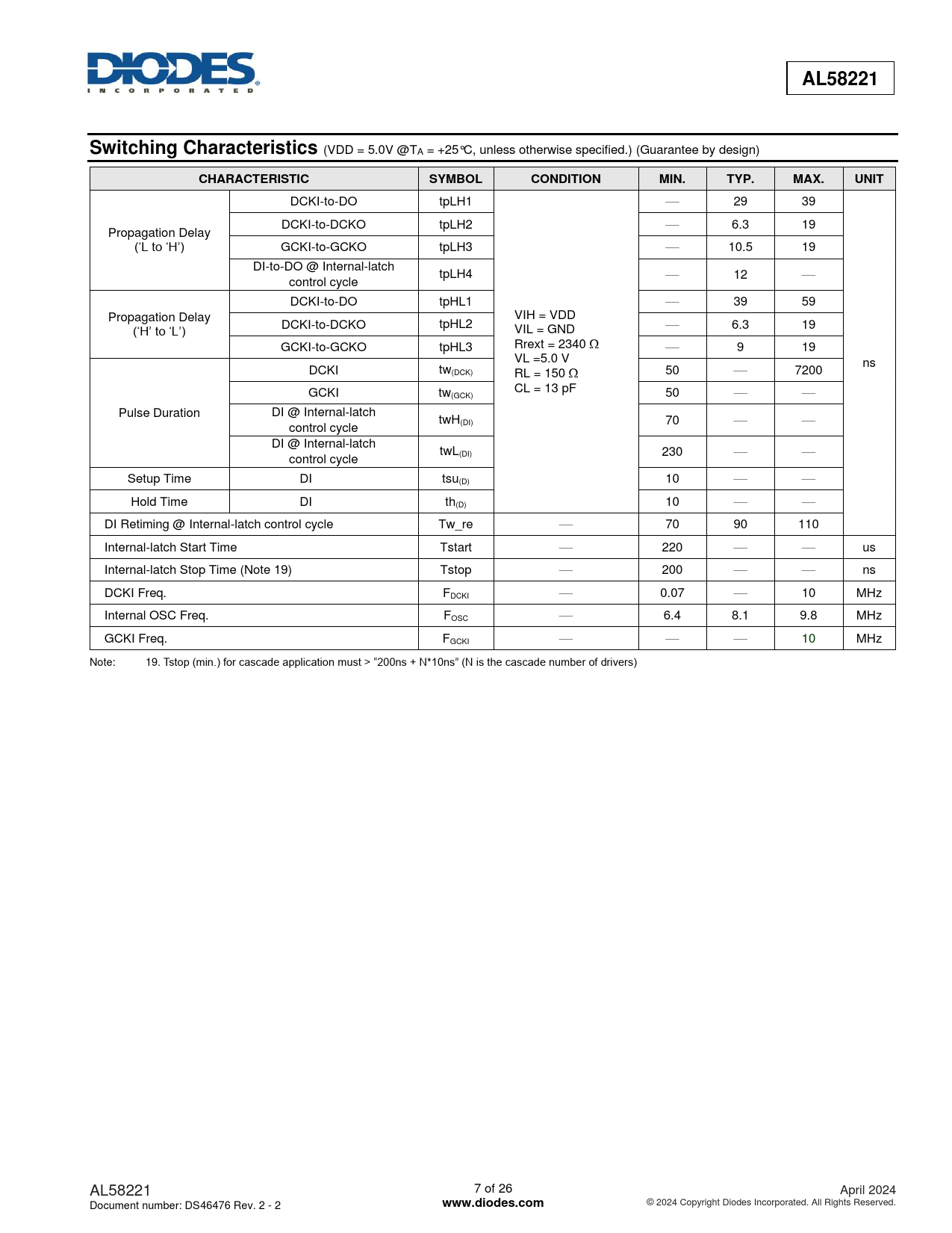DCKI-to-DO tpLH1 ⎯ 29 39 DCKI-to-DCKO tpLH2 ⎯ 6.3 19 Propagation Delay (‘L to ‘H’) GCKI-to-GCKO tpLH3 ⎯ 10.5 19 DI-to-DO @ Internal-latch tpLH4 ⎯ 12 ⎯ control cycle DCKI-to-DO tpHL1 ⎯ 39 59 VIH = VDD Propagation Delay (‘H’ to ‘L’) DCKI-to-DCKO tpHL2 ⎯ VIL = GND 6.3 19 Rrext = 2340 GCKI-to-GCKO tpHL3 ⎯ 9 19 VL =5.0 V ns DCKI tw(DCK) RL = 150 50 ⎯ 7200 CL = 13 pF GCKI tw(GCK) 50 ⎯ ⎯ Pulse Duration DI @ Internal-latch twH control cycle (DI) 70 ⎯ ⎯ DI @ Internal-latch twL control cycle (DI) 230 ⎯ ⎯ Setup Time DI tsu(D) 10 ⎯ ⎯ Hold Time DI th(D) 10 ⎯ ⎯ DI Retiming @ Internal-latch control cycle Tw_re ⎯ 70 90 110 Internal-latch Start Time Tstart ⎯ 220 ⎯ ⎯ us Internal-latch Stop Time (Note 19) Tstop ⎯ 200 ⎯ ⎯ ns DCKI Freq. FDCKI ⎯ 0.07 ⎯ 10 MHz Internal OSC Freq. FOSC ⎯ 6.4 8.1 9.8 MHz GCKI Freq. FGCKI ⎯ ⎯ ⎯ 10 MHz Note: 19. Tstop (min.) for cascade application must > “200ns + N*10ns” (N is the cascade number of drivers) AL58221 7 of 26 April 2024 Document number: DS46476 Rev. 2 - 2