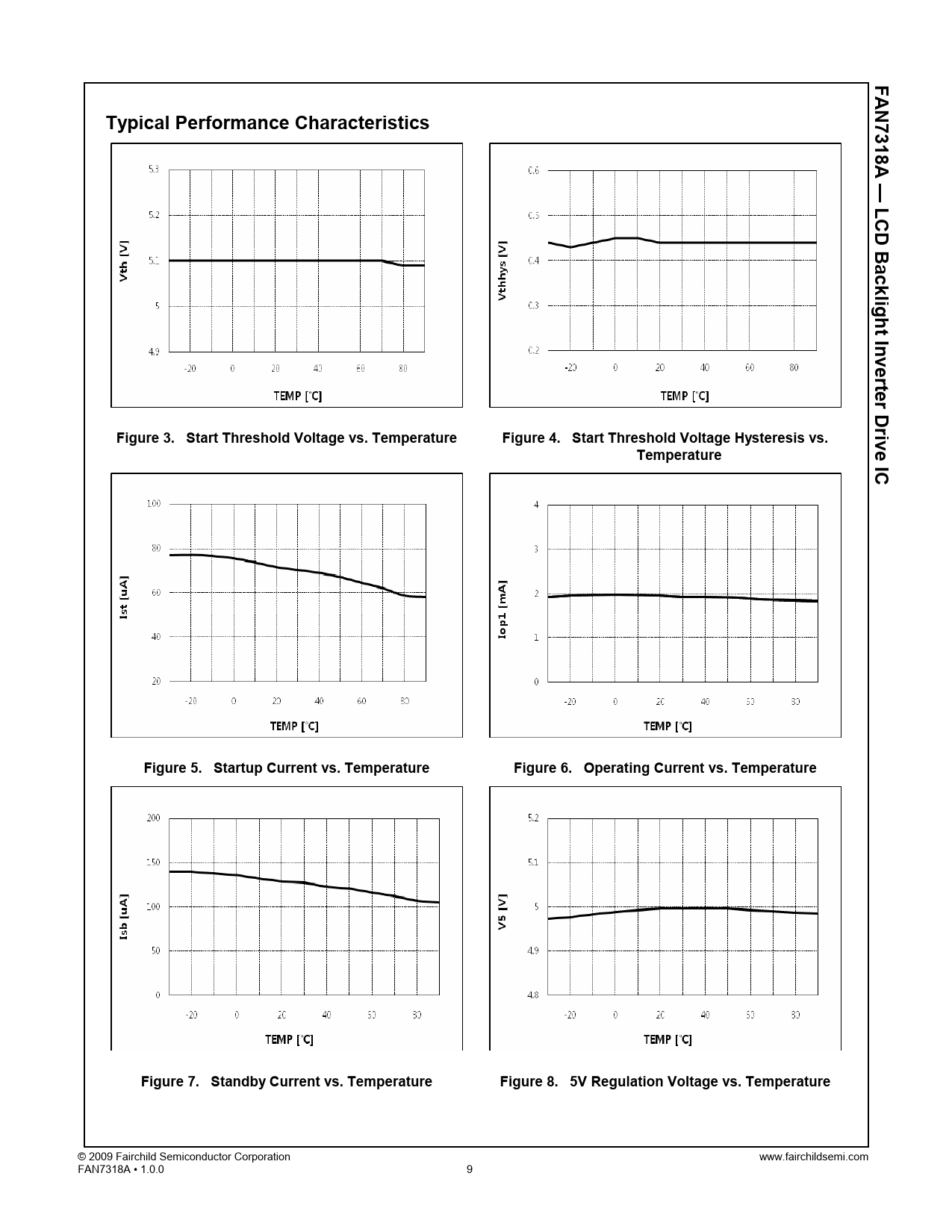 FA N 7318A Typical Performance Characteristics — LC D B a cklight Invert e r D rive IC Figure 3. Start Threshold Voltage vs. Temperature Figure 4. Start Threshold Voltage Hysteresis vs. Temperature Figure 5. Startup Current vs. Temperature Figure 6. Operating Current vs. Temperature Figure 7. Standby Current vs. Temperature Figure 8. 5V Regulation Voltage vs. Temperature