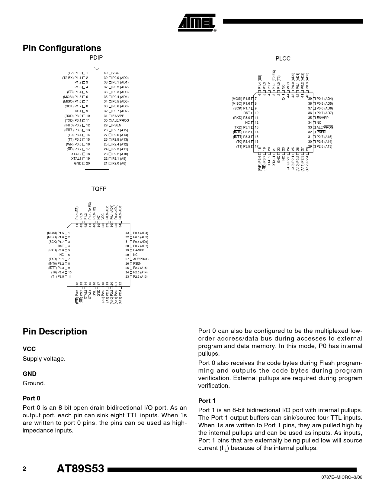 Páginas / Página35 / 2 — Pin Configurations. Pin Description. VCC. GND. Port 0. Port 1. AT89S53