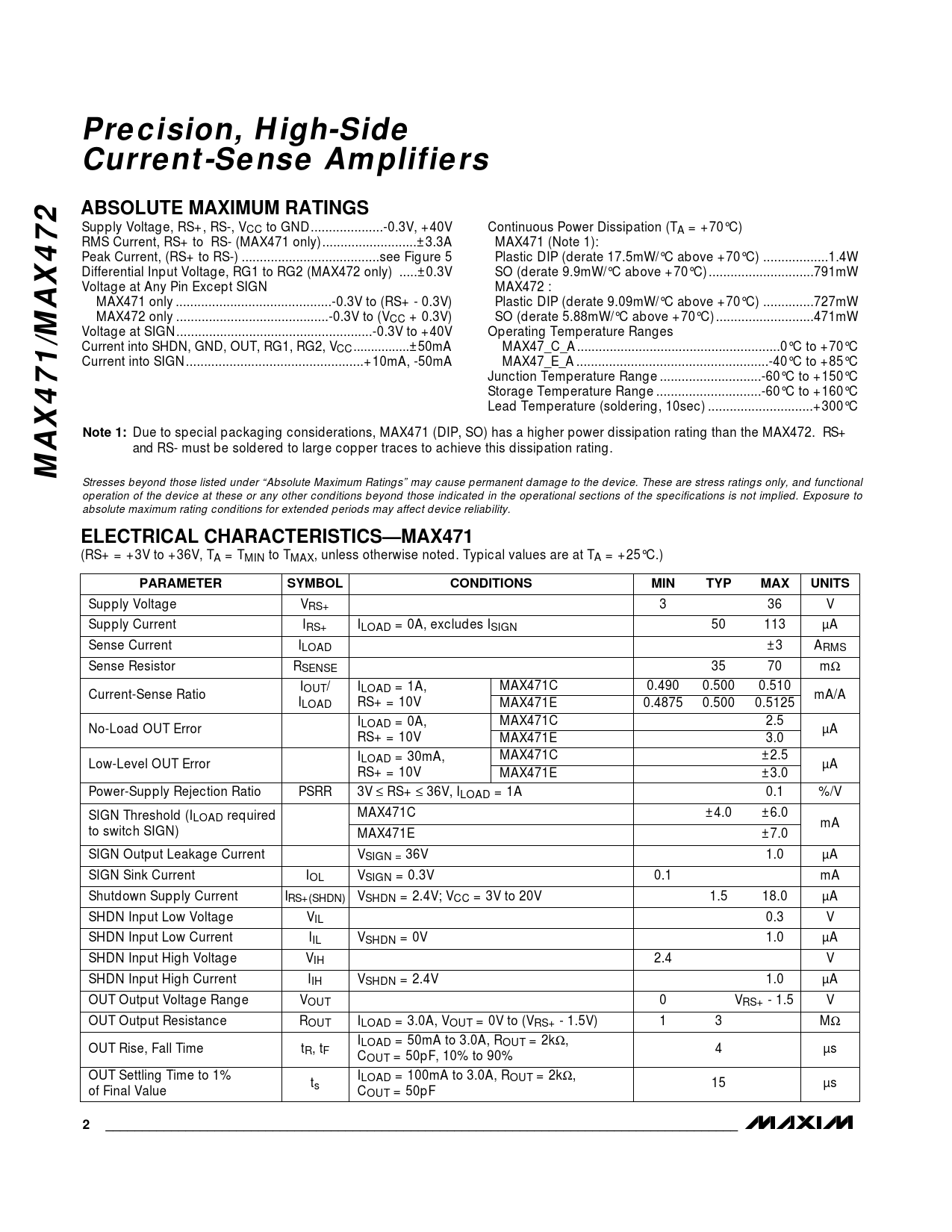 Precision, High-Side Current-Sense AmplifiersABSOLUTE MAXIMUM RATINGS Supply Voltage, RS+, RS-, VCC to GND..-0.3V, +40V Continuous Power Dissipation (TA = +70°C) RMS Current, RS+ to RS- (MAX471 only)..±3.3A MAX471 (Note 1): Peak Current, (RS+ to RS-) ..see Figure 5 Plastic DIP (derate 17.5mW/°C above +70°C) ..1.4W Differential Input Voltage, RG1 to RG2 (MAX472 only) ...±0.3V SO (derate 9.9mW/°C above +70°C) ...791mW Voltage at Any Pin Except SIGN MAX472 : MAX471 only ...-0.3V to (RS+ - 0.3V) Plastic DIP (derate 9.09mW/°C above +70°C) ..727mW MAX472 only ..-0.3V to (VCC + 0.3V) SO (derate 5.88mW/°C above +70°C) ...471mW Voltage at SIGN..-0.3V to +40V Operating Temperature Ranges Current into SHDN, GND, OUT, RG1, RG2, VCC..±50mA MAX47_C_A ..0°C to +70°C Current into SIGN...+10mA, -50mA MAX47_E_A ...-40°C to +85°C Junction Temperature Range ..-60°C to +150°C Storage Temperature Range ...-60°C to +160°C Lead Temperature (soldering, 10sec) ...+300°C Note 1: Due to special packaging considerations, MAX471 (DIP, SO) has a higher power dissipation rating than the MAX472. RS+ and RS- must be soldered to large copper traces to achieve this dissipation rating. MAX471/MAX472 Stresses beyond those listed under “Absolute Maximum Ratings” may cause permanent damage to the device. These are stress ratings only, and functional operation of the device at these or any other conditions beyond those indicated in the operational sections of the specifications is not implied. Exposure to absolute maximum rating conditions for extended periods may affect device reliability. ELECTRICAL CHARACTERISTICS—MAX471 (RS+ = +3V to +36V, TA = TMIN to TMAX, unless otherwise noted. Typical values are at TA = +25°C.) PARAMETERSYMBOLCONDITIONSMINTYPMAXUNITS Supply Voltage VRS+ 3 36 V Supply Current IRS+ ILOAD = 0A, excludes ISIGN 50 113 µA Sense Current ILOAD ±3 ARMS Sense Resistor RSENSE 35 70 mΩ IOUT/ ILOAD = 1A, MAX471C 0.490 0.500 0.510 Current-Sense Ratio mA/A ILOAD RS+ = 10V MAX471E 0.4875 0.500 0.5125 ILOAD = 0A, MAX471C 2.5 No-Load OUT Error µA RS+ = 10V MAX471E 3.0 ILOAD = 30mA, MAX471C ±2.5 Low-Level OUT Error µA RS+ = 10V MAX471E ±3.0 Power-Supply Rejection Ratio PSRR 3V ≤ RS+ ≤ 36V, ILOAD = 1A 0.1 %/V MAX471C ±4.0 ±6.0 SIGN Threshold (ILOAD required mA to switch SIGN) MAX471E ±7.0 SIGN Output Leakage Current VSIGN = 36V 1.0 µA SIGN Sink Current IOL VSIGN = 0.3V 0.1 mA Shutdown Supply Current IRS+(SHDN) VSHDN = 2.4V; VCC = 3V to 20V 1.5 18.0 µA SHDN Input Low Voltage VIL 0.3 V SHDN Input Low Current IIL VSHDN = 0V 1.0 µA SHDN Input High Voltage VIH 2.4 V SHDN Input High Current IIH VSHDN = 2.4V 1.0 µA OUT Output Voltage Range VOUT 0 VRS+ - 1.5 V OUT Output Resistance ROUT ILOAD = 3.0A, VOUT = 0V to (VRS+ - 1.5V) 1 3 MΩ I OUT Rise, Fall Time t LOAD = 50mA to 3.0A, ROUT = 2kΩ, R, tF 4 µs COUT = 50pF, 10% to 90% OUT Settling Time to 1% I t LOAD = 100mA to 3.0A, ROUT = 2kΩ, 15 µs of Final Value s COUT = 50pF 2_______________________________________________________________________________________ Document Outline not-recomm-data-sheet-cover.pdf Not Recommended for New Designs