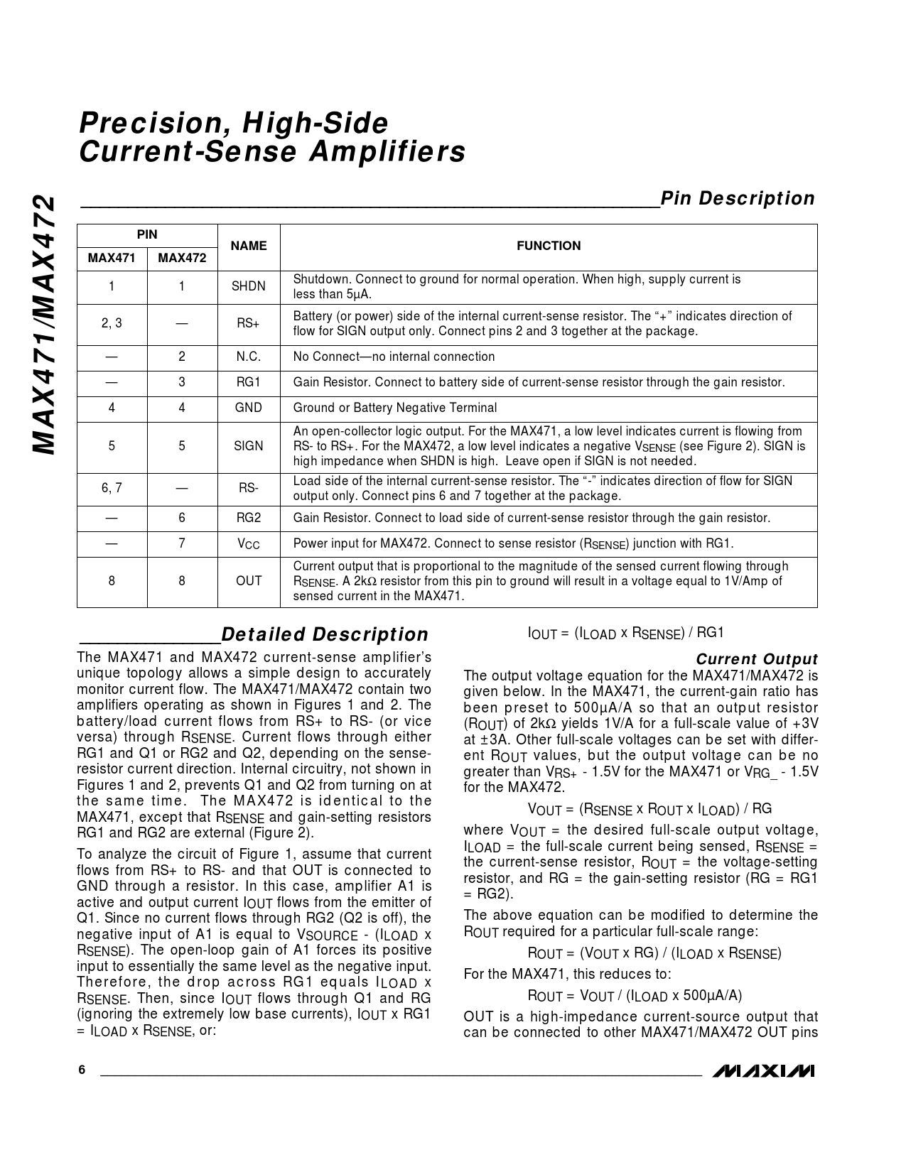 Precision, High-Side Current-Sense Amplifiers ______________________________________________________________Pin Description PIN NAME FUNCTION MAX471 MAX472