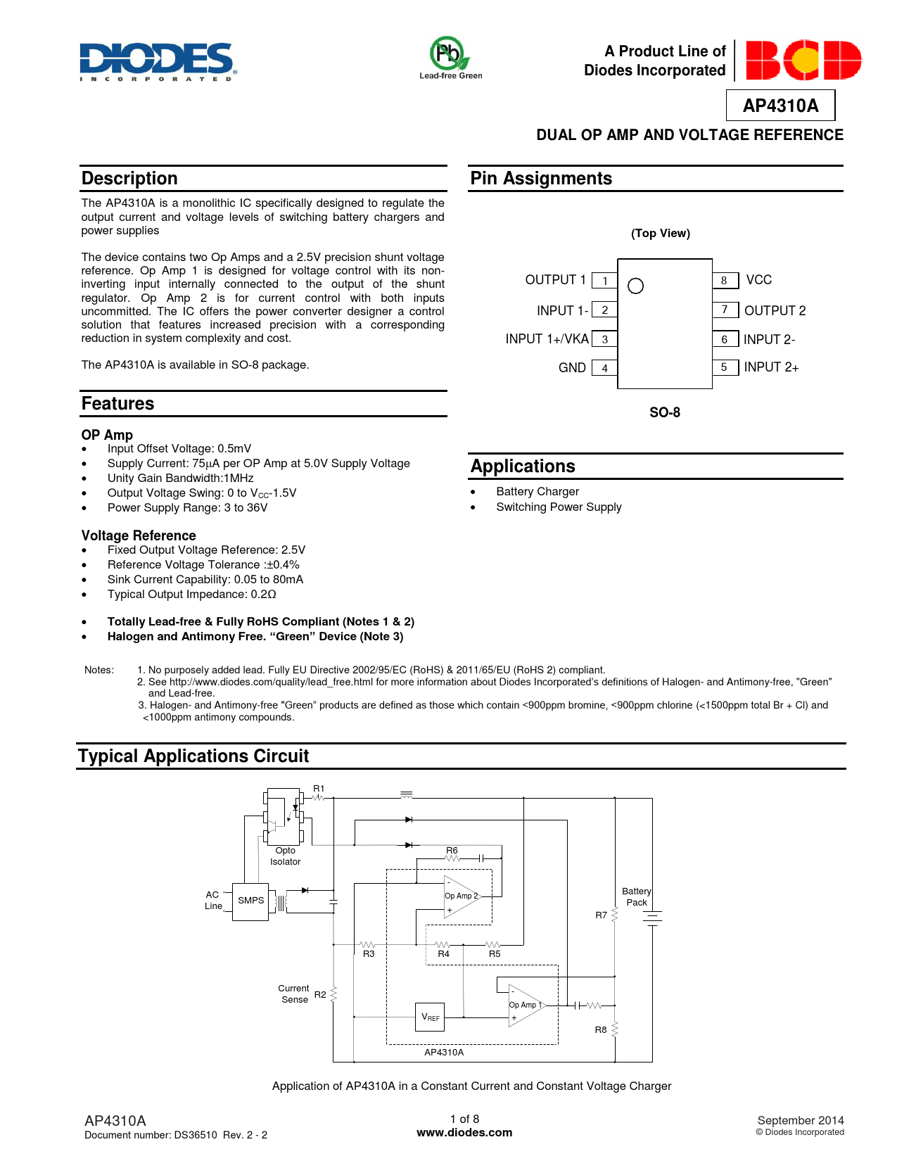 A Product Line of. Diodes Incorporated. AP4310A. DUAL OP AMP AND VOLTAGE REFERENCE. Description. Pin Assignments. (Top View)
