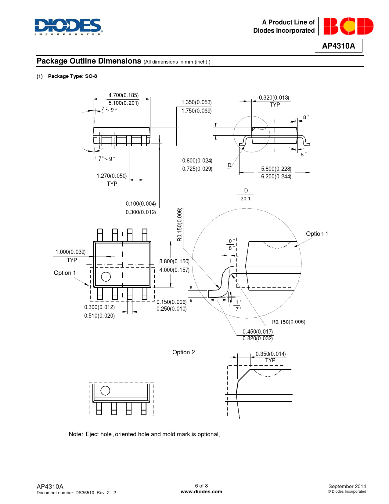 4.700(0.185) 0.320(0. 013) 5.100(0.201) 1.350(0. 053) TYP 7 ° ~ 9° 1.750(0. 069) 8 ° 8 ° 7° ~ 9° 0.600(0. 024) D 0.725(0. 029) 5.800(0. 228) 1.270(0. 050) 6.200(0. 244) TYP D 20:1 0.100(0. 004) 6 0.300(0. 012) 0 .0 (0 0 5 .1 0 Option 1 R 0 ° 8 ° 1.000(0. 039) TYP 3.800(0. 150) 4.000(0. 157) Option 1 0.150(0. 006) 1 ° 0.300(0. 012) 0.250(0. 010) 7 ° 0.510(0. 020) R0.150(0.006) 0.450(0. 017) 0.820(0. 032) Option 2 0.350(0. 014) TYP Note: Eject hole , oriented hole and mold mark is optional . AP4310A 6 of 8 September 2014 Document number: DS36510 Rev. 2 - 2