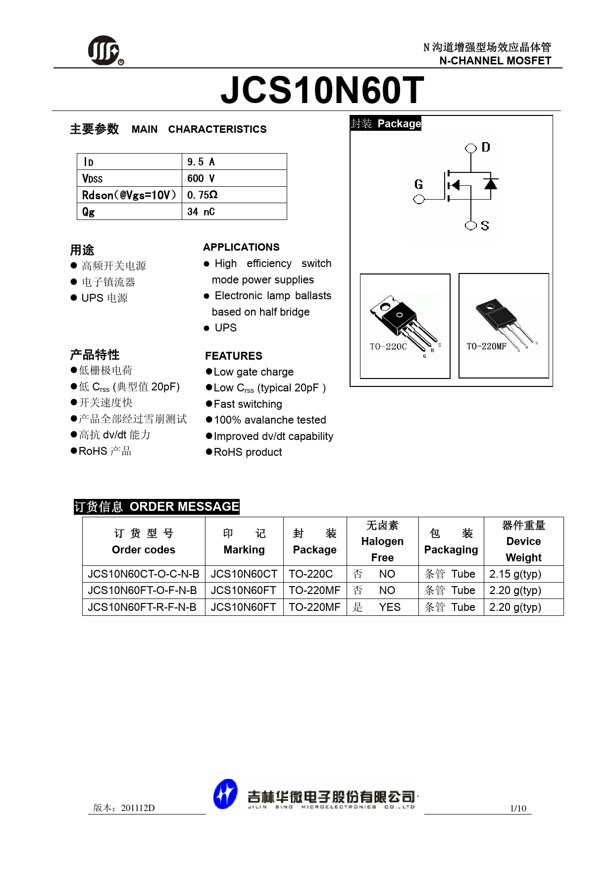 N 沟道增强型场效应晶体管 RN-CHANNEL MOSFETJCS10N60T 封装 Package 主要参数 MAIN CHARACTERISTICS ID 9.5 A VDSS 600 V Rdson(@Vgs=10V) 0.75 Ω Qg 34 nC 用途 APPLICATIONS z 高频开关电源 z High efficiency switch z 电子镇流器 mode power supplies z UPS 电源 z Electronic lamp ballasts based on half bridge z UPS 产品特性 FEATURES z 低栅极电荷 z Low gate charge z 低 Crss (典型值 20pF) z Low C rss (typical 20pF ) z 开关速度快 z Fast switching z 产品全部经过雪崩测试 z 100% avalanche tested z 高抗 dv/dt 能力 z Improved dv/dt capability z RoHS 产品 z RoHS product 订货信息 ORDER MESSAGE 无卤素 器件重量 订 货 型 号 印 记 封 装 包 装 HalogenDeviceOrder codesMarkingPackagePackagingFreeWeight JCS10N60CT-O-C-N-B JCS10N60CT TO-220C 否 NO 条管 Tube 2.15 g(typ) JCS10N60FT-O-F-N-B JCS10N60FT TO-220MF 否 NO 条管 Tube 2.20 g(typ) JCS10N60FT-R-F-N-B JCS10N60FT TO-220MF 是 YES 条管 Tube 2.20 g(typ) 版本:201112D 1/10