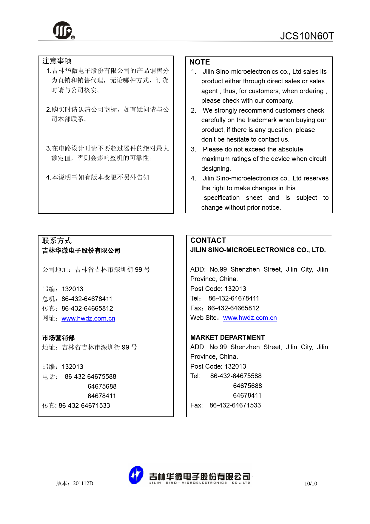 R JCS10N60T 注意事项 NOTE 1.吉林华微电子股份有限公司的产品销售分 1. Jilin Sino-microelectronics co., Ltd sales its 为直销和销售代理,无论哪种方式,订货 product either through direct sales or sales 时请与公司核实。 agent , thus, for customers, when ordering , please check with our company. 2.购买时请认清公司商标,如有疑问请与公 2. We strongly recommend customers check 司本部联系。 carefully on the trademark when buying our product, if there is any question, please don’t be hesitate to contact us. 3.在电路设计时请不要超过器件的绝对最大 3. Please do not exceed the absolute 额定值,否则会影响整机的可靠性。 maximum ratings of the device when circuit designing. 4.本说明书如有版本变更不另外告知 4. Jilin Sino-microelectronics co., Ltd reserves the right to make changes in this specification sheet and is subject to change without prior notice. 联系方式 CONTACT 吉林华微电子股份有限公司 JILIN SINO-MICROELECTRONICS CO., LTD. 公司地址:吉林省吉林市深圳街 99 号 ADD: No.99 Shenzhen Street, Jilin City, Jilin Province, China. 邮编:132013 Post Code: 132013 总机:86-432-64678411 Tel: 86-432-64678411 传真:86-432-64665812 Fax:86-432-64665812 网址:www.hwdz.com.cn Web Site:www.hwdz.com.cn 市场营销部 MARKET DEPARTMENT 地址:吉林省吉林市深圳街 99 号 ADD: No.99 Shenzhen Street, Jilin City, Jilin Province, China. 邮编:132013 Post Code: 132013 电话: 86-432-64675588 Tel: 86-432-64675588 64675688 64675688 64678411 64678411 传真: 86-432-64671533 Fax: 86-432-64671533 版本:201112D 10/10