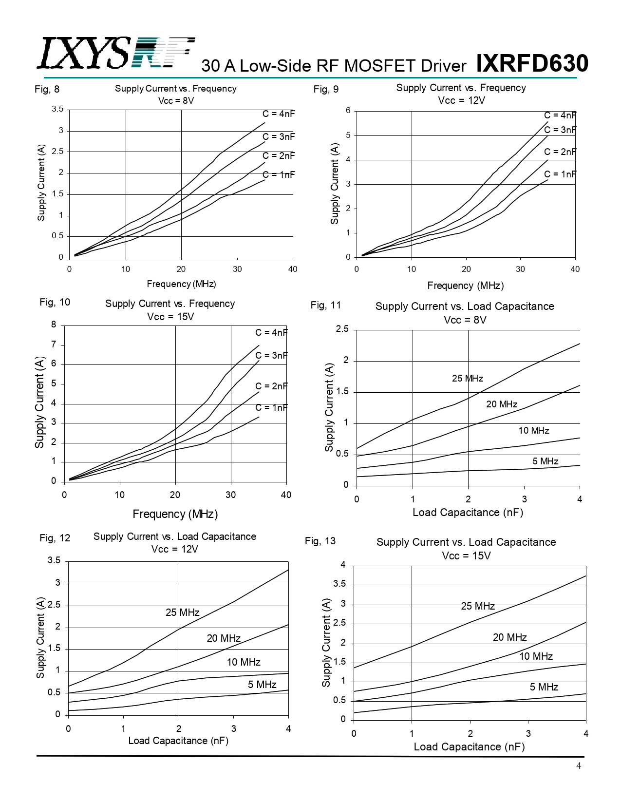 30 A Low-Side RF MOSFET Driver IXRFD630 Fig, 8 Supply Current vs. Frequency Fig, 9 Supply Current vs. Frequency Vcc = 8V Vcc = 12V 3.5 6 C = 4nF C = 4nF 3 C = 3nF 5 C = 3nF ) 2.5 C = 2nF t (A) C = 2nF t (A 4 n n 2 rre C = 1nF rre C = 1nF u u 3 C C 1.5 ly ly p p p 2 p u 1 u S S 1 0.5 0 0 0 10 20 30 40 0 10 20 30 40 Frequency (MHz) Frequency (MHz) Fig, 10 Supply Current vs. Frequency Fig, 11 Supply Current vs. Load Capacitance Vcc = 15V Vcc = 8V 8 2.5 C = 4nF 7 ) C = 3nF 2 6 ) t (A n t (A 25 MHz 5 C = 2nF n 1.5 rre u rre 4 C = 1nF u 20 MHz C C ly 3 1 p ly p p 10 MHz u p 2 u S S 0.5 1 5 MHz 0 0 0 10 20 30 40 0 1 2 3 4 Frequency (MHz) Load Capacitance (nF) Fig, 12 Supply Current vs. Load Capacitance Fig, 13 Supply Current vs. Load Capacitance Vcc = 12V Vcc = 15V 3.5 4 3 3.5 ) 2.5 3 25 MHz t (A 25 MHz n t (A n 2 2.5 rre u 20 MHz rre 20 MHz C u 2 1.5 ly C p 10 MHz p 10 MHz ly 1.5 u p 1 S p u 5 MHz 1 S 5 MHz 0.5 0.5 0 0 0 1 2 3 4 0 1 2 3 4 Load Capacitance (nF) Load Capacitance (nF) 4