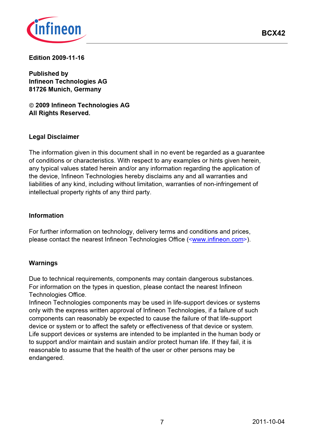 BCX42Edition 2009-11-16 Published by Infineon Technologies AG 81726 Munich, Germany2009 Infineon Technologies AGAll Rights Reserved. Legal Disclaimer The information given in this document shall in no event be regarded as a guarantee of conditions or characteristics. With respect to any examples or hints given herein, any typical values stated herein and/or any information regarding the application of the device, Infineon Technologies hereby disclaims any and all warranties and liabilities of any kind, including without limitation, warranties of non-infringement of intellectual property rights of any third party. Information For further information on technology, delivery terms and conditions and prices, please contact the nearest Infineon Technologies Office (<www.infineon.com>). Warnings Due to technical requirements, components may contain dangerous substances. For information on the types in question, please contact the nearest Infineon Technologies Office. Infineon Technologies components may be used in life-support devices or systems only with the express written approval of Infineon Technologies, if a failure of such components can reasonably be expected to cause the failure of that life-support device or system or to affect the safety or effectiveness of that device or system. Life support devices or systems are intended to be implanted in the human body or to support and/or maintain and sustain and/or protect human life. If they fail, it is reasonable to assume that the health of the user or other persons may be endangered. 7 2011-10-04