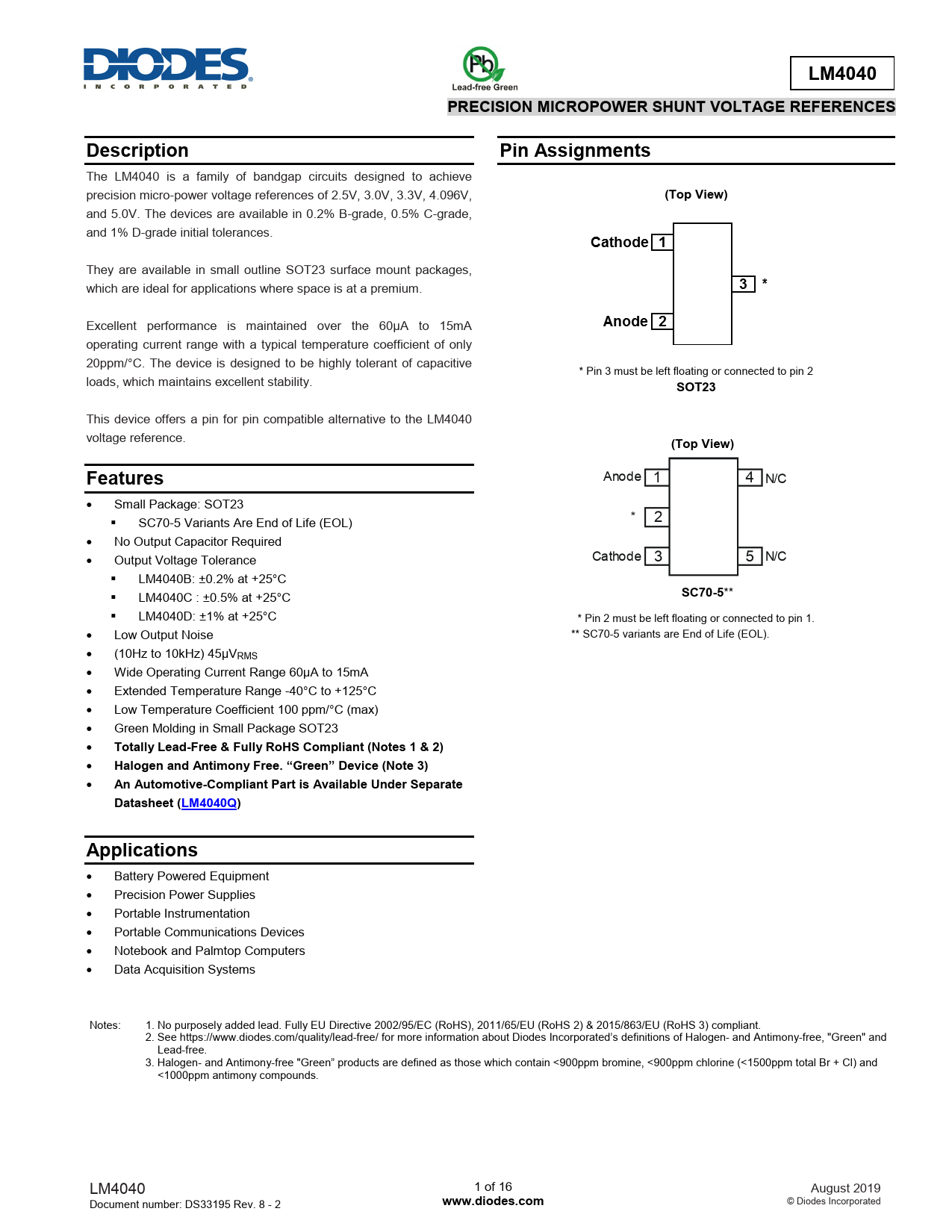 ** * Pin 2 must be left floating or connected to pi n 1 LM4040D: ±1% at +25°C * Pin 2 must be left floating or connected to pin 1. • Low Output Noise ** SC70-5 variants are End of Life (EOL). • (10Hz to 10kHz) 45µVRMS • Wide Operating Current Range 60µA to 15mA • Extended Temperature Range -40°C to +125°C • Low Temperature Coefficient 100 ppm/°C (max) • Green Molding in Small Package SOT23 •