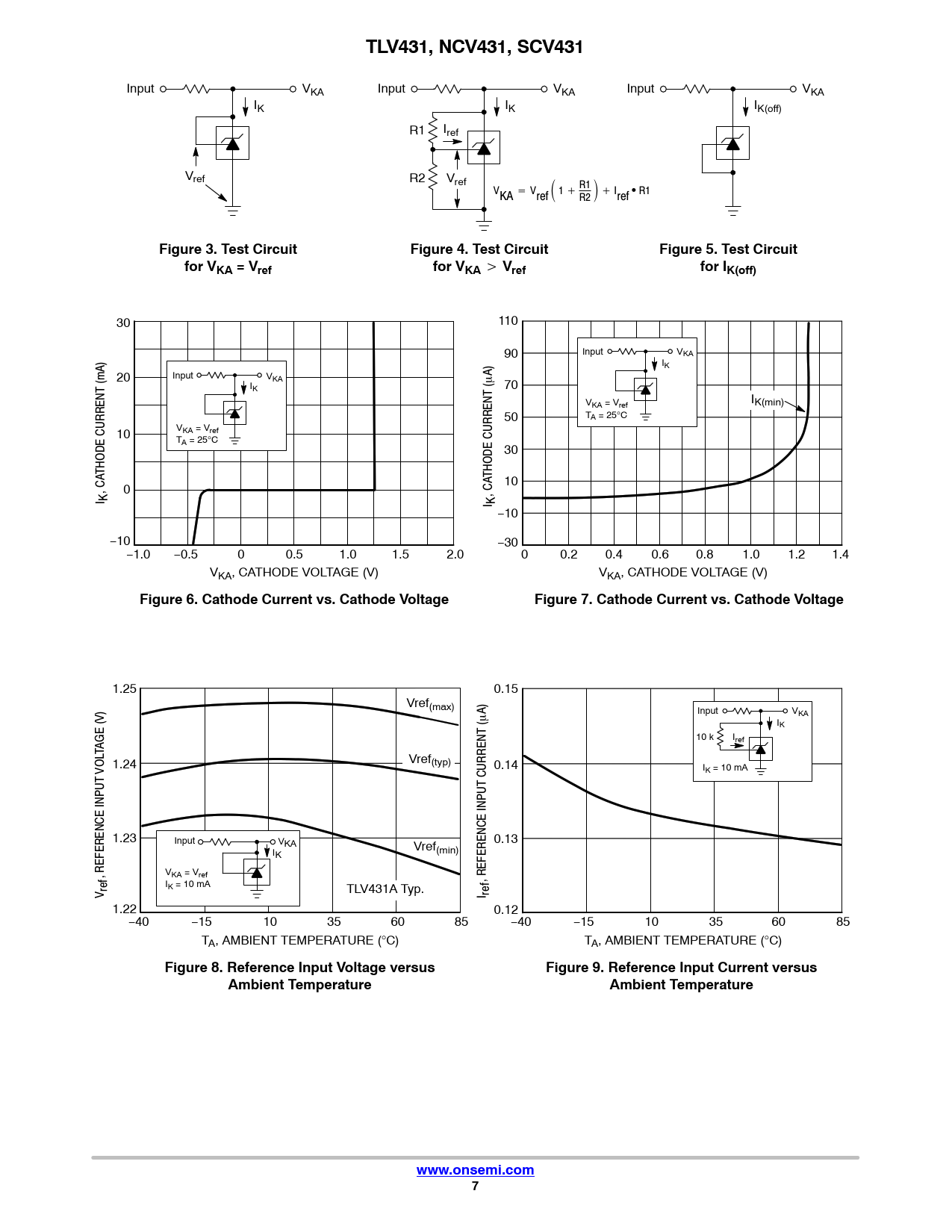 TLV431, NCV431, SCV431 Input VKA Input VKA Input VKA IK IK IK(off) R1 Iref Vref R2 Vref V + V ǒ1 ) R1Ǔ ) I SR1 KA ref R2 ref Figure 3. Test CircuitFigure 4. Test CircuitFigure 5. Test Circuitfor VKA = Vreffor VKA u Vreffor IK(off) 30 110 90 Input VKA IK 20 A) Input V (mA) KA m IK ( 70 V I KA = Vref K(min) 50 TA = 25°C 10 VKA = Vref TA = 25°C 30 THODE CURRENT THODE CURRENT 10 , CA 0 , CA I K I K −10 −10 −30 −1.0 −0.5 0 0.5 1.0 1.5 2.0 0 0.2 0.4 0.6 0.8 1.0 1.2 1.4 VKA, CATHODE VOLTAGE (V) VKA, CATHODE VOLTAGE (V) Figure 6. Cathode Current vs. Cathode VoltageFigure 7. Cathode Current vs. Cathode Voltage 1.25 0.15 Vref(max) A) Input VKA m ( IK 10 k Iref TAGE (V) Vref(typ) 1.24 0.14 I VOL K = 10 mA CURRENT 1.23 Input V 0.13 KA Vref(min) IK , REFERENCE INPUT VKA = Vref , REFERENCE INPUT ref IK = 10 mA TLV431A Typ. V I ref 1.22 0.12 −40 −15 10 35 60 85 −40 −15 10 35 60 85 TA, AMBIENT TEMPERATURE (°C) TA, AMBIENT TEMPERATURE (°C) Figure 8. Reference Input Voltage versusFigure 9. Reference Input Current versusAmbient TemperatureAmbient Temperaturewww.onsemi.com7