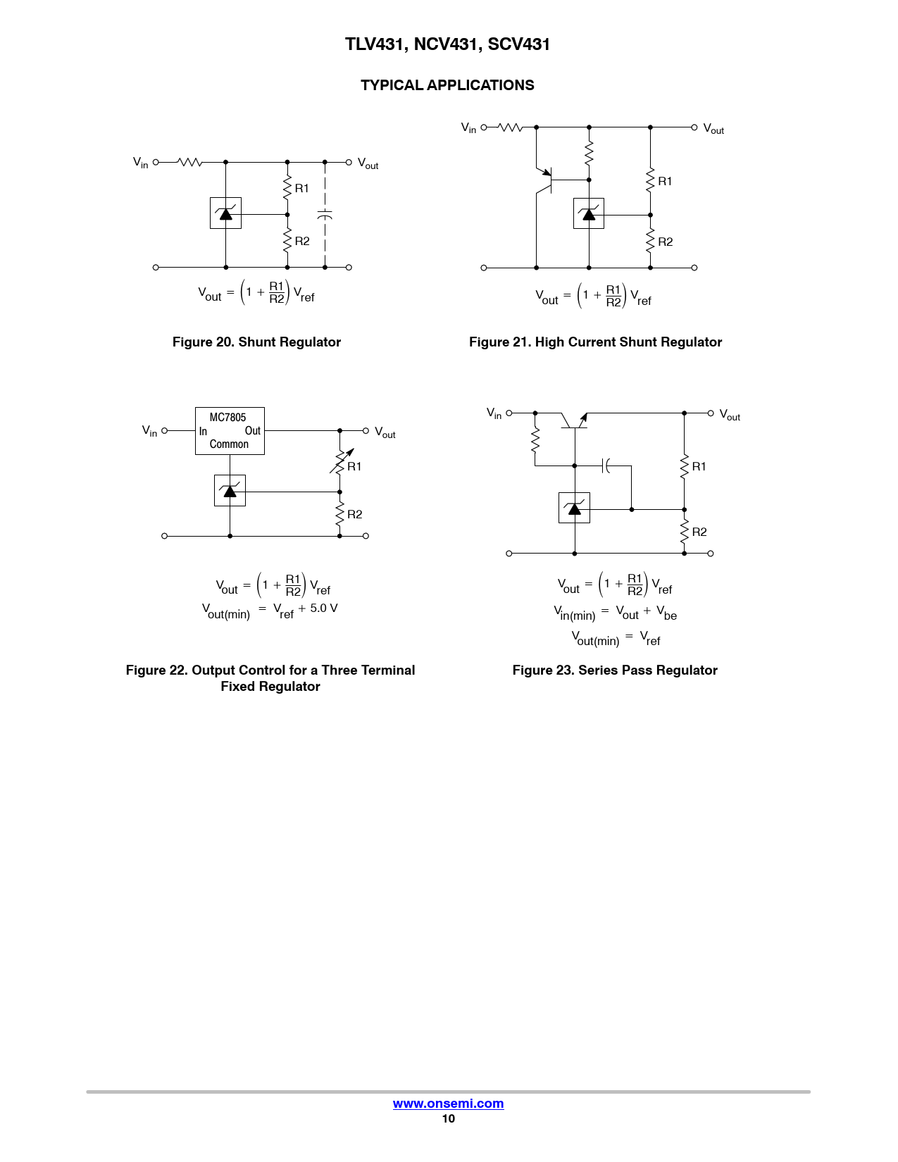 TLV431, NCV431, SCV431TYPICAL APPLICATIONS Vin Vout Vin Vout R1 R1 R2 R2 V Ǔ out + ǒ1 ) R1 V Ǔ R2 ref Vout + ǒ1 ) R1 V R2 ref Figure 20. Shunt RegulatorFigure 21. High Current Shunt Regulator V MC7805 in Vout Vin In Out Vout Common R1 R1 R2 R2 V Ǔ Ǔ out + ǒ1 ) R1 V V V R2 ref out + ǒ1 ) R1 R2 ref Vout(min) + Vref ) 5.0 V Vin(min) + Vout ) Vbe Vout(min) + Vref Figure 22. Output Control for a Three TerminalFigure 23. Series Pass RegulatorFixed Regulatorwww.onsemi.com10