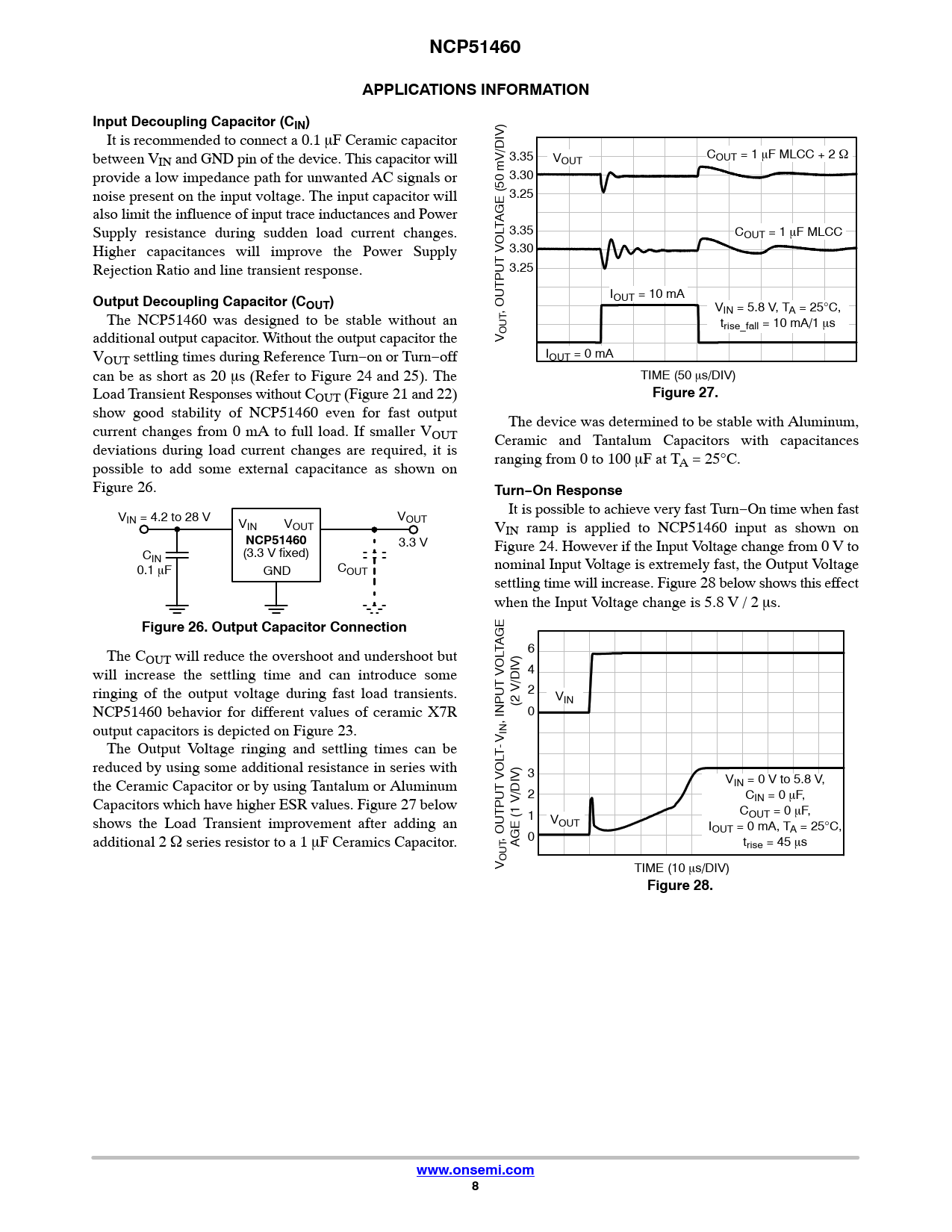 link to page 8 link to page 8 link to page 7 link to page 8 link to page 9 link to page 8 link to page 9 link to page 8 link to page 9 NCP51460APPLICATIONS INFORMATIONInput Decoupling Capacitor (CIN) It is recommended to connect a 0.1 mF Ceramic capacitor between V C IN and GND pin of the device. This capacitor will 3.35 V OUT = 1 mF MLCC + 2 W OUT provide a low impedance path for unwanted AC signals or 3.30 noise present on the input voltage. The input capacitor will 3.25 also limit the influence of input trace inductances and Power Supply resistance during sudden load current changes. TAGE (50 mV/DIV) 3.35 COUT = 1 mF MLCC Higher capacitances will improve the Power Supply 3.30 Rejection Ratio and line transient response. 3.25 Output Decoupling Capacitor (C IOUT = 10 mA OUT) , OUTPUT VOL V The NCP51460 was designed to be stable without an IN = 5.8 V, TA = 25°C, trise_fall = 10 mA/1 ms additional output capacitor. Without the output capacitor the V OUT VOUT settling times during Reference Turn−on or Turn−off IOUT = 0 mA can be as short as 20 ms (Refer to Figure 24 and 25). The TIME (50 ms/DIV) Load Transient Responses without COUT (Figure 21 and 22) Figure 27. show good stability of NCP51460 even for fast output The device was determined to be stable with Aluminum, current changes from 0 mA to full load. If smaller VOUT Ceramic and Tantalum Capacitors with capacitances deviations during load current changes are required, it is ranging from 0 to 100 possible to add some external capacitance as shown on mF at TA = 25°C. Figure 26. Turn−On Response It is possible to achieve very fast Turn−On time when fast VIN = 4.2 to 28 V V VOUT IN VOUT VIN ramp is applied to NCP51460 input as shown on NCP51460 3.3 V Figure 24. However if the Input Voltage change from 0 V to CIN (3.3 V fixed) 0.1 mF GND C nominal Input Voltage is extremely fast, the Output Voltage OUT settling time will increase. Figure 28 below shows this effect when the Input Voltage change is 5.8 V / 2 ms. Figure 26. Output Capacitor Connection The C TAGE 6 OUT will reduce the overshoot and undershoot but will increase the settling time and can introduce some 4 ringing of the output voltage during fast load transients. 2 (2 V/DIV) VIN NCP51460 behavior for different values of ceramic X7R 0 , INPUT VOL output capacitors is depicted on Figure 23. V IN The Output Voltage ringing and settling times can be T- reduced by using some additional resistance in series with 3 the Ceramic Capacitor or by using Tantalum or Aluminum VIN = 0 V to 5.8 V, 2 C Capacitors which have higher ESR values. Figure 27 below IN = 0 mF, COUT = 0 mF, shows the Load Transient improvement after adding an 1 VOUT IOUT = 0 mA, TA = 25°C, additional 2 W series resistor to a 1 mF Ceramics Capacitor. , OUTPUT VOL 0 AGE (1 V/DIV) trise = 45 ms V OUT TIME (10 ms/DIV) Figure 28.www.onsemi.com8
