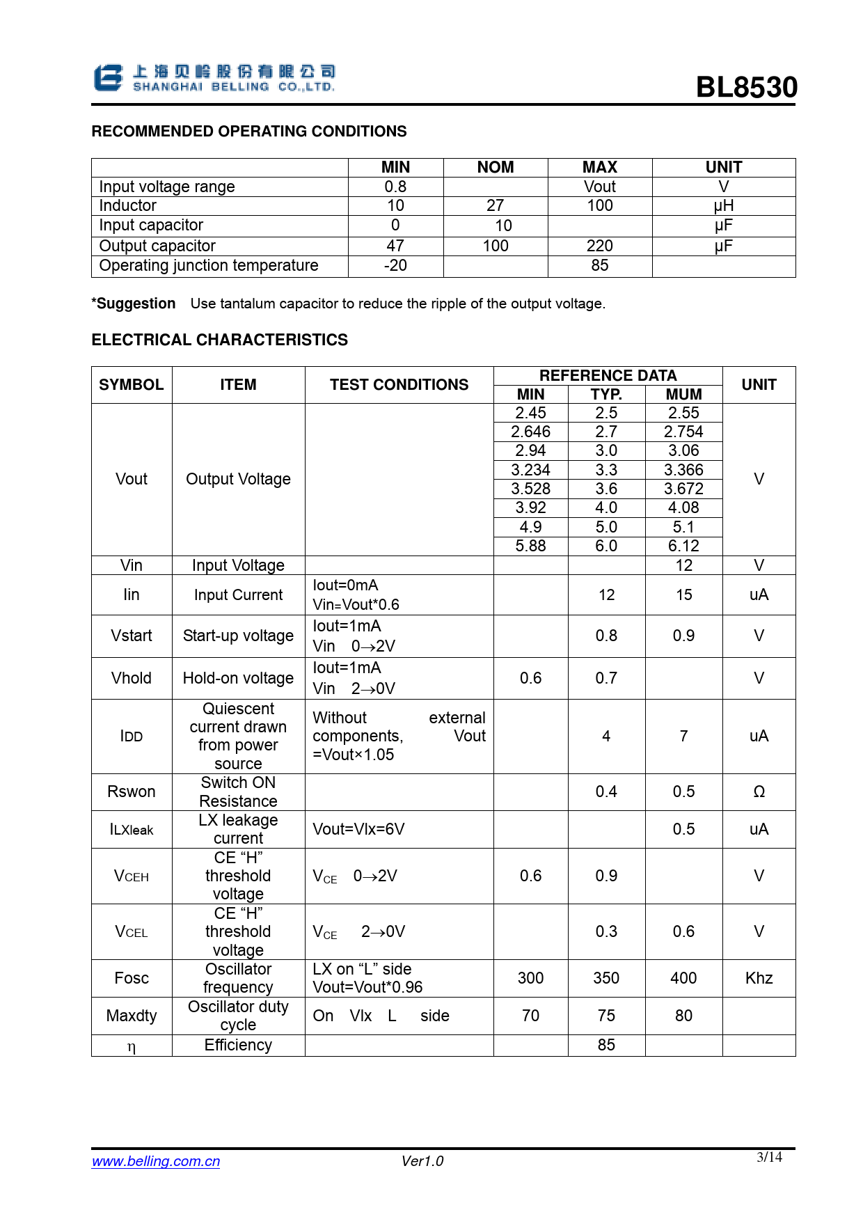 BL8530. RECOMMENDED OPERATING CONDITIONS. MIN. NOM. MAX. UNIT. *Suggestion. ELECTRICAL CHARACTERISTICS. REFERENCE DATA. SYMBOL ITEM. TEST