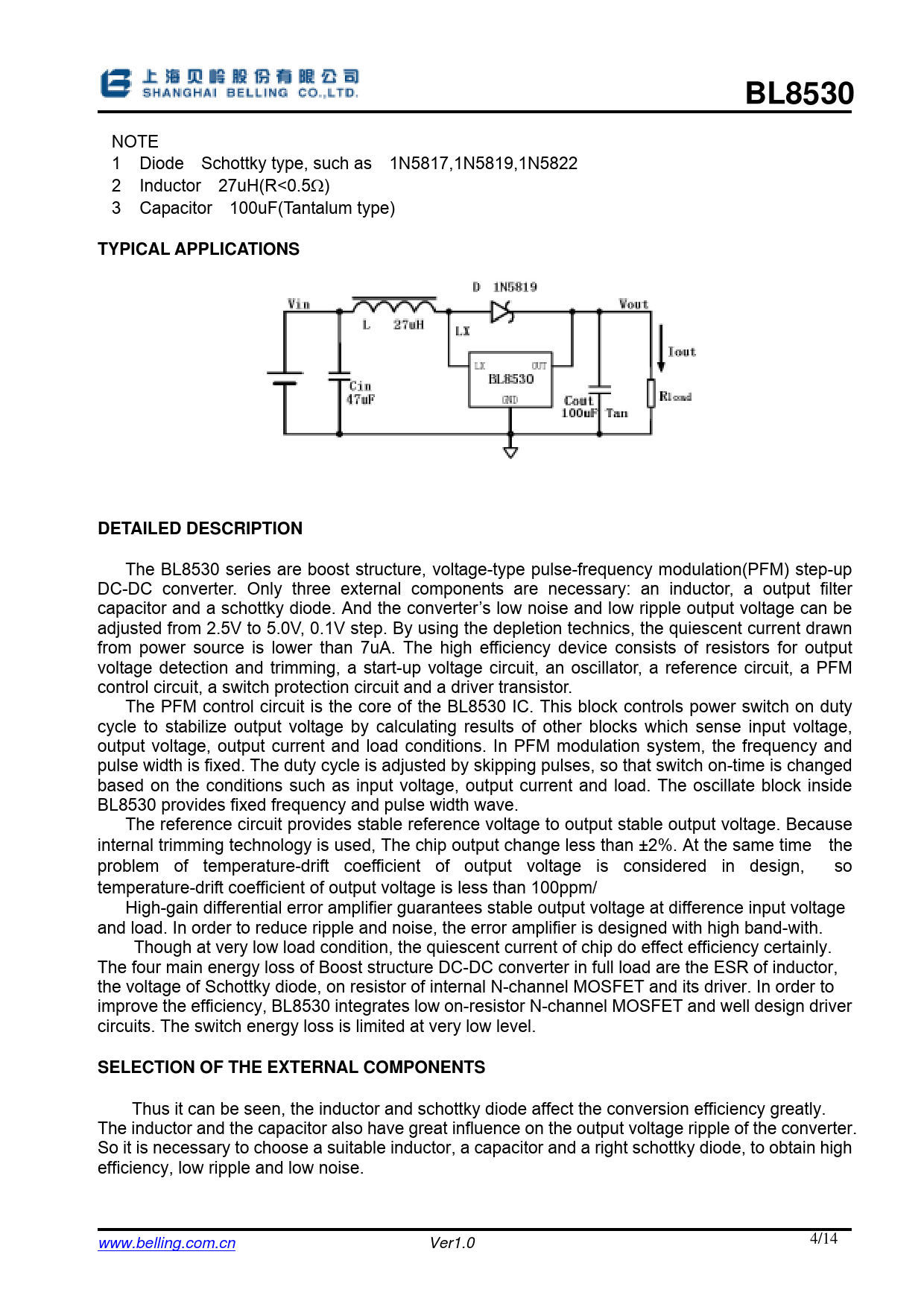 BL8530 NOTE: 1、 Diode:Schottky type, such as:1N5817,1N5819,1N5822 2、 Inductor:27uH(R<0.5Ω) 3、 Capacitor:100uF(Tantalum type) TYPICAL APPLICATIONS : DETAILED DESCRIPTION The BL8530 series are boost structure, voltage-type pulse-frequency modulation(PFM) step-up DC-DC converter. Only three external components are necessary: an inductor, a output filter capacitor and a schottky diode. And the converter’s low noise and low ripple output voltage can be adjusted from 2.5V to 5.0V, 0.1V step. By using the depletion technics, the quiescent current drawn from power source is lower than 7uA. The high efficiency device consists of resistors for output voltage detection and trimming, a start-up voltage circuit, an oscillator, a reference circuit, a PFM control circuit, a switch protection circuit and a driver transistor. The PFM control circuit is the core of the BL8530 IC. This block controls power switch on duty cycle to stabilize output voltage by calculating results of other blocks which sense input voltage, output voltage, output current and load conditions. In PFM modulation system, the frequency and pulse width is fixed. The duty cycle is adjusted by skipping pulses, so that switch on-time is changed based on the conditions such as input voltage, output current and load. The oscillate block inside BL8530 provides fixed frequency and pulse width wave. The reference circuit provides stable reference voltage to output stable output voltage. Because internal trimming technology is used, The chip output change less than ±2%. At the same time,the problem of temperature-drift coefficient of output voltage is considered in design, so temperature-drift coefficient of output voltage is less than 100ppm/℃。 High-gain differential error amplifier guarantees stable output voltage at difference input voltage and load. In order to reduce ripple and noise, the error amplifier is designed with high band-with. Though at very low load condition, the quiescent current of chip do effect efficiency certainly. The four main energy loss of Boost structure DC-DC converter in full load are the ESR of inductor, the voltage of Schottky diode, on resistor of internal N-channel MOSFET and its driver. In order to improve the efficiency, BL8530 integrates low on-resistor N-channel MOSFET and well design driver circuits. The switch energy loss is limited at very low level. SELECTION OF THE EXTERNAL COMPONENTS Thus it can be seen, the inductor and schottky diode affect the conversion efficiency greatly. The inductor and the capacitor also have great influence on the output voltage ripple of the converter. So it is necessary to choose a suitable inductor, a capacitor and a right schottky diode, to obtain high efficiency, low ripple and low noise. www.belling.com.cn Ver1.0 4/ 14