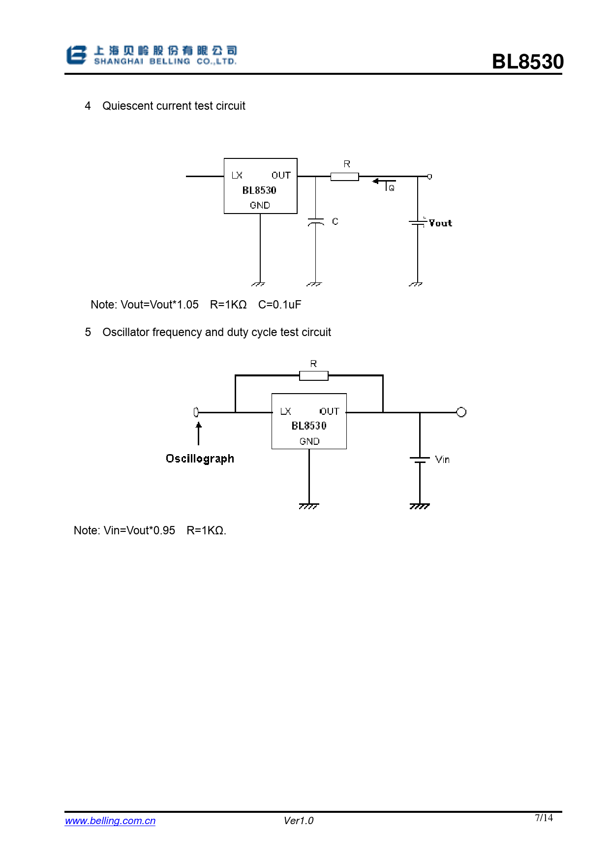 (4)Quiescent current test circuit Note: Vout=Vout*1.05,R=1KΩ,C=0.1uF。 (5)Oscillator frequency and duty cycle test circuit Note: Vin=Vout*0.95,R=1KΩ. www.belling.com.cn Ver1.0 7/ 14