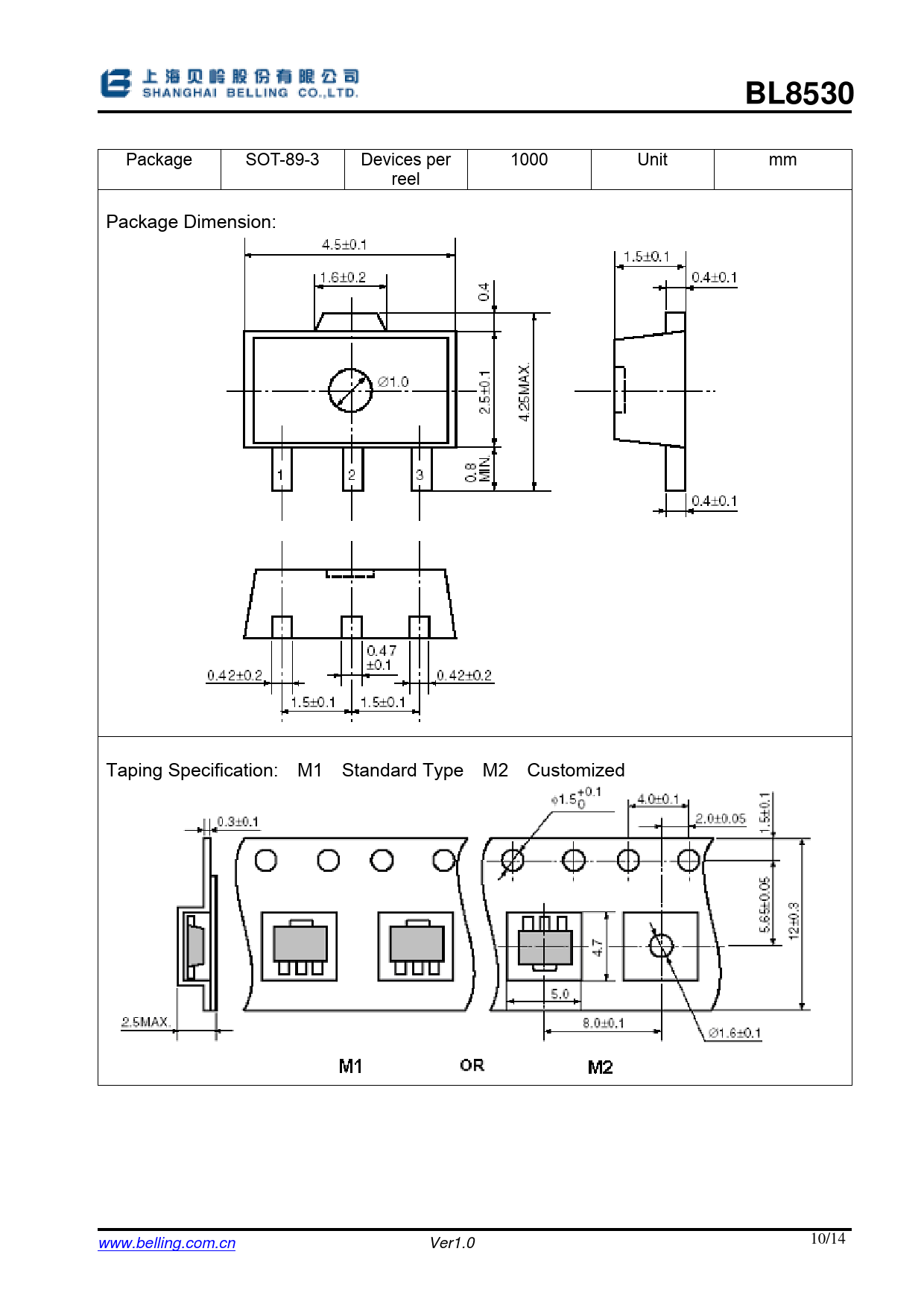 Package SOT-89-3 Devices per 1000 Unit mm reel Package Dimension: Taping Specification:(M1:Standard Type,M2:Customized) www.belling.com.cn Ver1.0 10/ 14