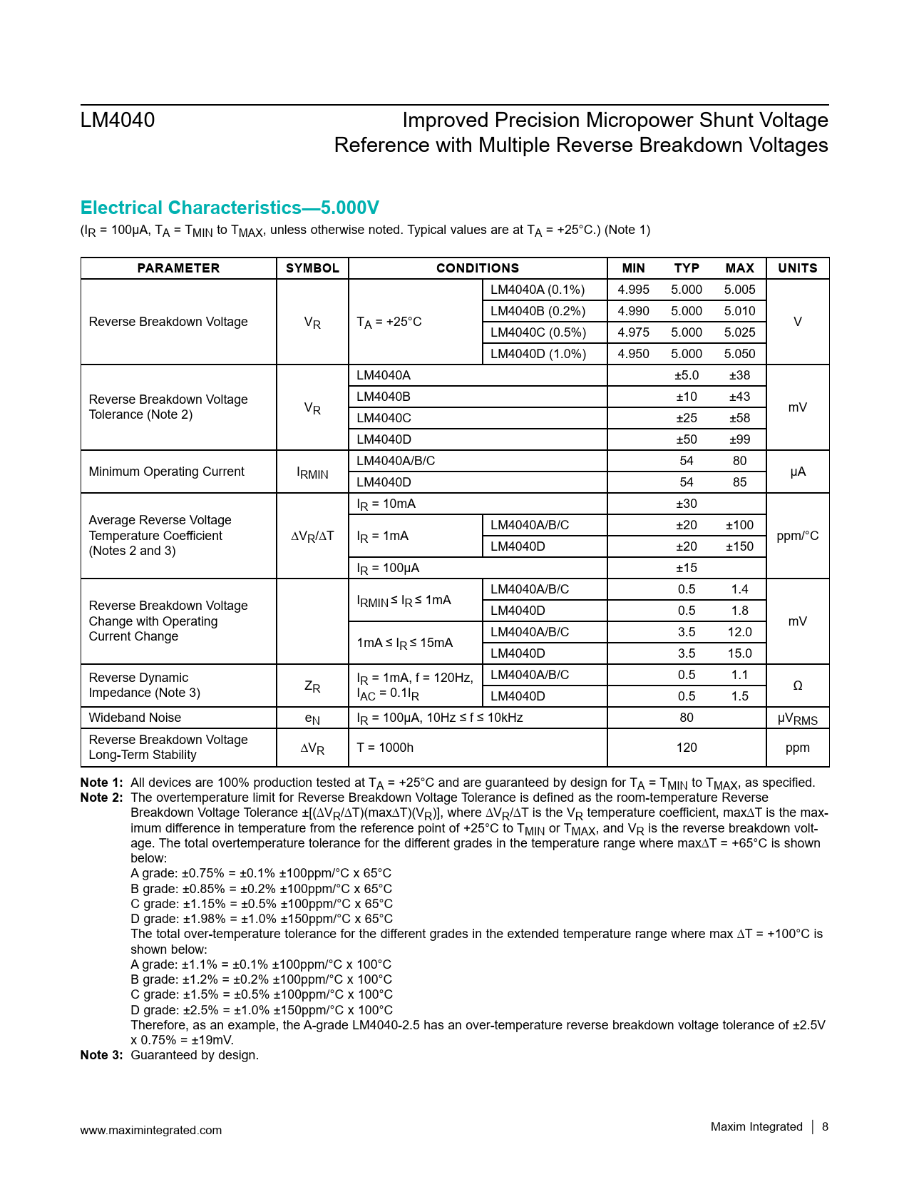LM4040 Improved Precision Micropower Shunt Voltage Reference with Multiple Reverse Breakdown Voltages Electrical Characteristics—5.000V (IR = 100μA, TA = TMIN to TMAX, unless otherwise noted. Typical values are at TA = +25°C.) (Note 1) PARAMETERSYMBOLCONDITIONSMINTYPMAXUNITS LM4040A (0.1%) 4.995 5.000 5.005 LM4040B (0.2%) 4.990 5.000 5.010 Reverse Breakdown Voltage VR TA = +25°C V LM4040C (0.5%) 4.975 5.000 5.025 LM4040D (1.0%) 4.950 5.000 5.050 LM4040A ±5.0 ±38 Reverse Breakdown Voltage LM4040B ±10 ±43 Tolerance (Note 2) VR mV LM4040C ±25 ±58 LM4040D ±50 ±99 LM4040A/B/C 54 80 Minimum Operating Current IRMIN µA LM4040D 54 85 IR = 10mA ±30 Average Reverse Voltage LM4040A/B/C ±20 ±100 Temperature Coefficient ∆VR/∆T IR = 1mA ppm/°C (Notes 2 and 3) LM4040D ±20 ±150 IR = 100µA ±15 LM4040A/B/C 0.5 1.4 Reverse Breakdown Voltage IRMIN ≤ I ≤ 1mA R LM4040D 0.5 1.8 Change with Operating mV Current Change LM4040A/B/C 3.5 12.0 1mA ≤ IR ≤ 15mA LM4040D 3.5 15.0 Reverse Dynamic IR = 1mA, f = 120Hz, LM4040A/B/C 0.5 1.1 Impedance (Note 3) ZR I Ω AC = 0.1IR LM4040D 0.5 1.5 Wideband Noise eN IR = 100µA, 10Hz ≤ f ≤ 10kHz 80 µVRMS Reverse Breakdown Voltage Long-Term Stability ∆VR T = 1000h 120 ppm Note 1: All devices are 100% production tested at TA = +25°C and are guaranteed by design for TA = TMIN to TMAX, as specified. Note 2: The overtemperature limit for Reverse Breakdown Voltage Tolerance is defined as the room-temperature Reverse Breakdown Voltage Tolerance ±[(∆VR/∆T)(max∆T)(VR)], where ∆VR/∆T is the VR temperature coefficient, max∆T is the max- imum difference in temperature from the reference point of +25°C to TMIN or TMAX, and VR is the reverse breakdown volt- age. The total overtemperature tolerance for the different grades in the temperature range where max∆T = +65°C is shown below: A grade: ±0.75% = ±0.1% ±100ppm/°C x 65°C B grade: ±0.85% = ±0.2% ±100ppm/°C x 65°C C grade: ±1.15% = ±0.5% ±100ppm/°C x 65°C D grade: ±1.98% = ±1.0% ±150ppm/°C x 65°C The total over-temperature tolerance for the different grades in the extended temperature range where max ∆T = +100°C is shown below: A grade: ±1.1% = ±0.1% ±100ppm/°C x 100°C B grade: ±1.2% = ±0.2% ±100ppm/°C x 100°C C grade: ±1.5% = ±0.5% ±100ppm/°C x 100°C D grade: ±2.5% = ±1.0% ±150ppm/°C x 100°C Therefore, as an example, the A-grade LM4040-2.5 has an over-temperature reverse breakdown voltage tolerance of ±2.5V x 0.75% = ±19mV. Note 3: Guaranteed by design. www.maximintegrated.com Maxim Integrated │ 8