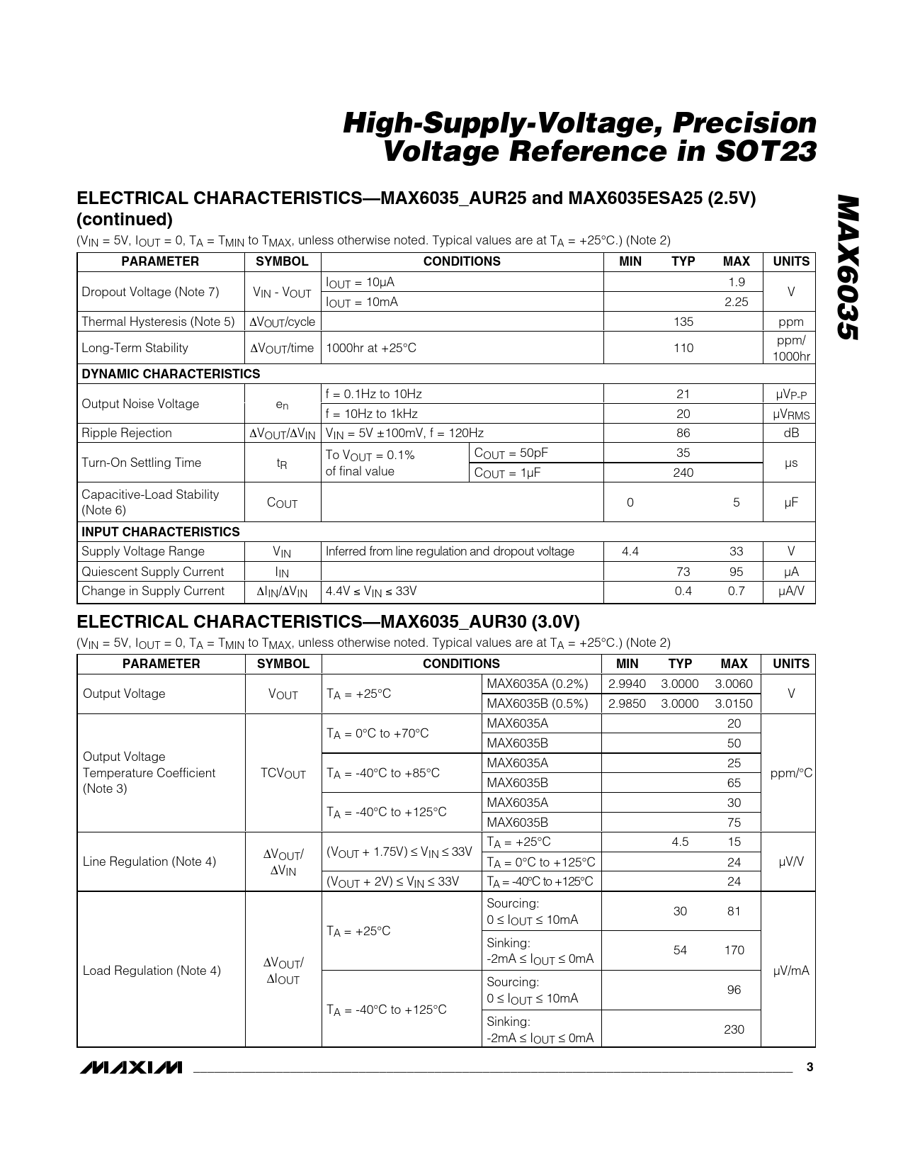 High-Supply-Voltage, Precision Voltage Reference in SOT23 MAX6035 ELECTRICAL CHARACTERISTICS—MAX6035_AUR25 and MAX6035ESA25 (2.5V) (continued)