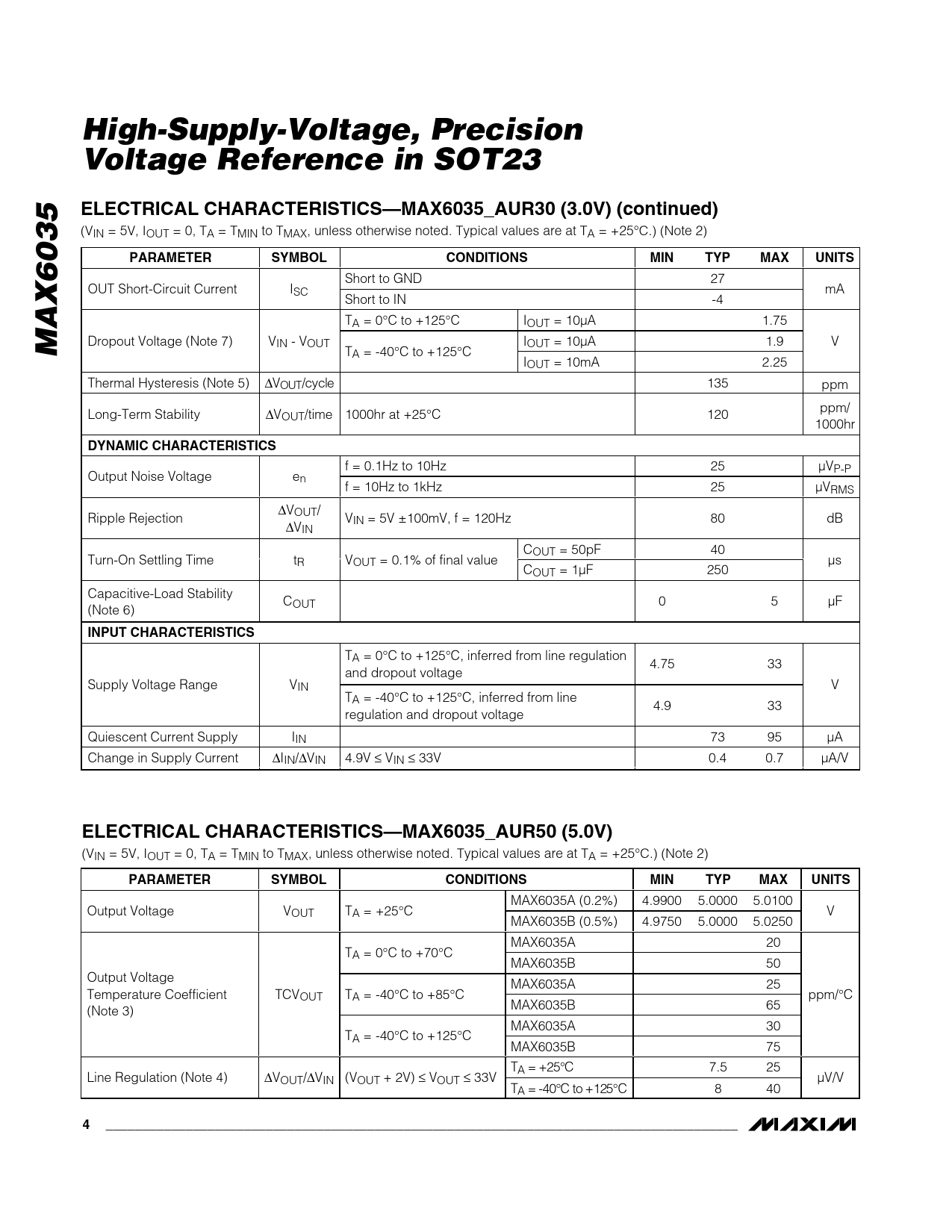High-Supply-Voltage, Precision Voltage Reference in SOT23ELECTRICAL CHARACTERISTICS—MAX6035_AUR30 (3.0V) (continued) (VIN = 5V, IOUT = 0, TA = TMIN to TMAX, unless otherwise noted. Typical values are at TA = +25°C.) (Note 2) PARAMETERSYMBOLCONDITIONSMINTYPMAXUNITS Short to GND 27 OUT Short-Circuit Current ISC mA Short to IN -4 TA = 0°C to +125°C IOUT = 10µA 1.75 MAX6035 Dropout Voltage (Note 7) VIN - VOUT IOUT = 10µA 1.9 V TA = -40°C to +125°C IOUT = 10mA 2.25 Thermal Hysteresis (Note 5) ∆V OU T /cycl e 135 ppm ppm/ Long-Term Stability ∆VOUT/time 1000hr at +25°C 120 1000hr DYNAMIC CHARACTERISTICS f = 0.1Hz to 10Hz 25 µVP-P Output Noise Voltage en f = 10Hz to 1kHz 25 µVRMS ∆V Ripple Rejection OUT/ ∆ VIN = 5V ±100mV, f = 120Hz 80 dB VIN COUT = 50pF 40 Turn-On Settling Time tR VOUT = 0.1% of final value µs COUT = 1µF 250 Capacitive-Load Stability COUT 0 5 µF (Note 6) INPUT CHARACTERISTICS TA = 0°C to +125°C, inferred from line regulation 4.75 33 and dropout voltage Supply Voltage Range VIN V TA = -40°C to +125°C, inferred from line 4.9 33 regulation and dropout voltage Quiescent Current Supply IIN 73 95 µA Change in Supply Current ∆IIN/∆VIN 4.9V ≤ VIN ≤ 33V 0.4 0.7 µA/V ELECTRICAL CHARACTERISTICS—MAX6035_AUR50 (5.0V) (VIN = 5V, IOUT = 0, TA = TMIN to TMAX, unless otherwise noted. Typical values are at TA = +25°C.) (Note 2) PARAMETERSYMBOLCONDITIONSMINTYPMAXUNITS MAX6035A (0.2%) 4.9900 5.0000 5.0100 Output Voltage VOUT TA = +25°C V MAX6035B (0.5%) 4.9750 5.0000 5.0250 MAX6035A 20 TA = 0°C to +70°C MAX6035B 50 Output Voltage MAX6035A 25 Temperature Coefficient TCVOUT TA = -40°C to +85°C ppm/°C MAX6035B 65 (Note 3) MAX6035A 30 TA = -40°C to +125°C MAX6035B 75 TA = + 25°C 7.5 25 Line Regulation (Note 4) ∆VOUT/∆VIN (VOUT + 2V) ≤ VOUT ≤ 33V µV/V TA = - 40°C to + 125°C 8 40 4_______________________________________________________________________________________