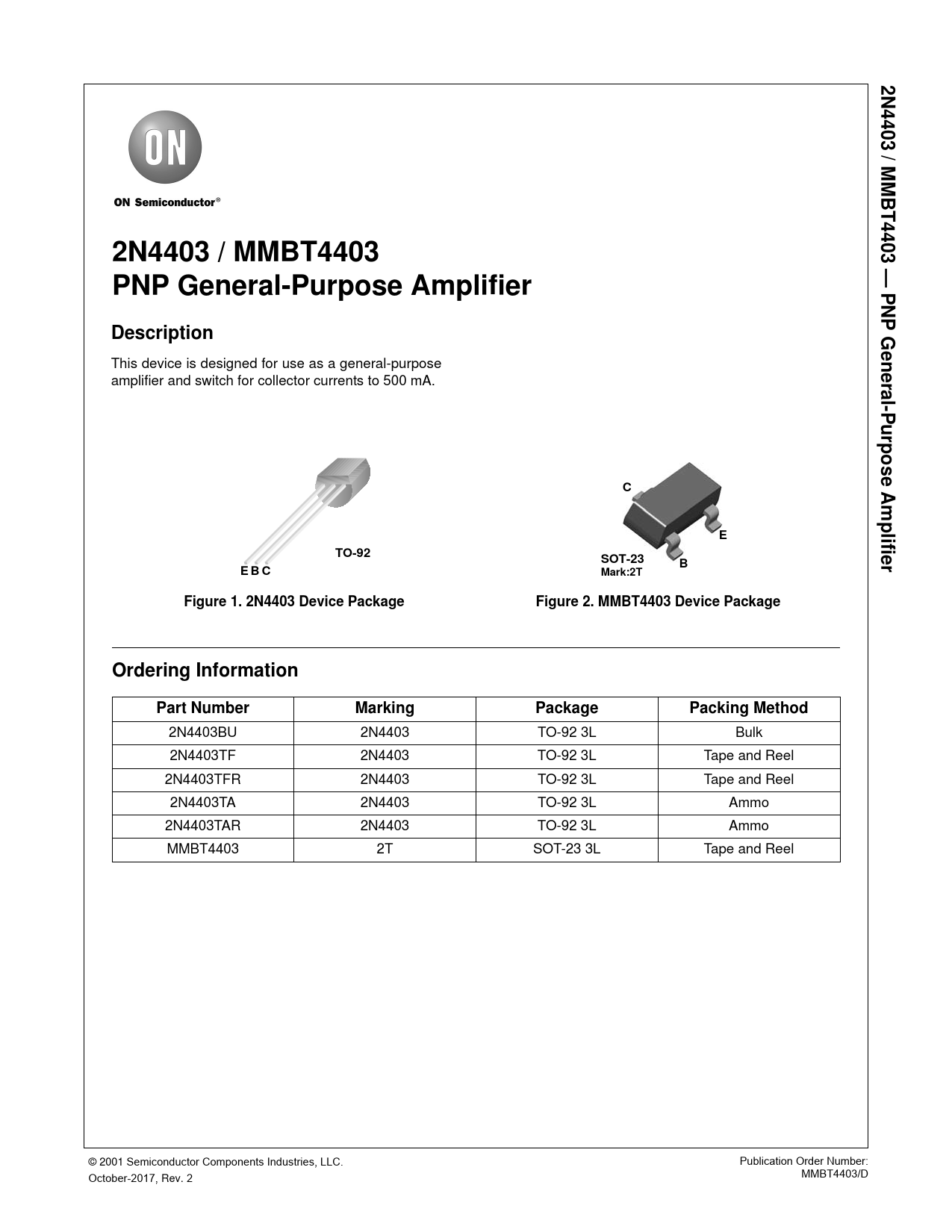 2N4403BU 2N4403 TO-92 3L Bulk 2N4403TF 2N4403 TO-92 3L Tape and Reel 2N4403TFR 2N4403 TO-92 3L Tape and Reel 2N4403TA 2N4403 TO-92 3L Ammo 2N4403TAR 2N4403 TO-92 3L Ammo MMBT4403 2T SOT-23 3L Tape and Reel © 2001 Semiconductor Components Industries, LLC. Publication Order Number: MMBT4403/D October-2017, Rev. 2