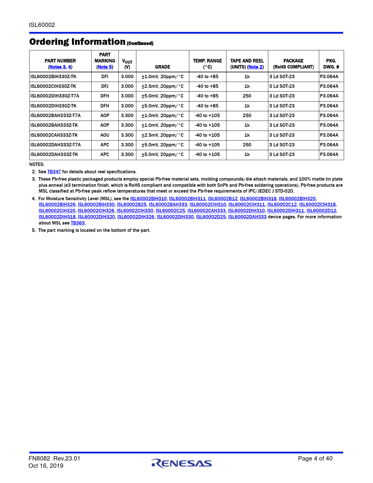 | Páginas / Página | 40 / 4 — ISL60002. Ordering. Information. (Continued). PART. PART. NUMBER. … |