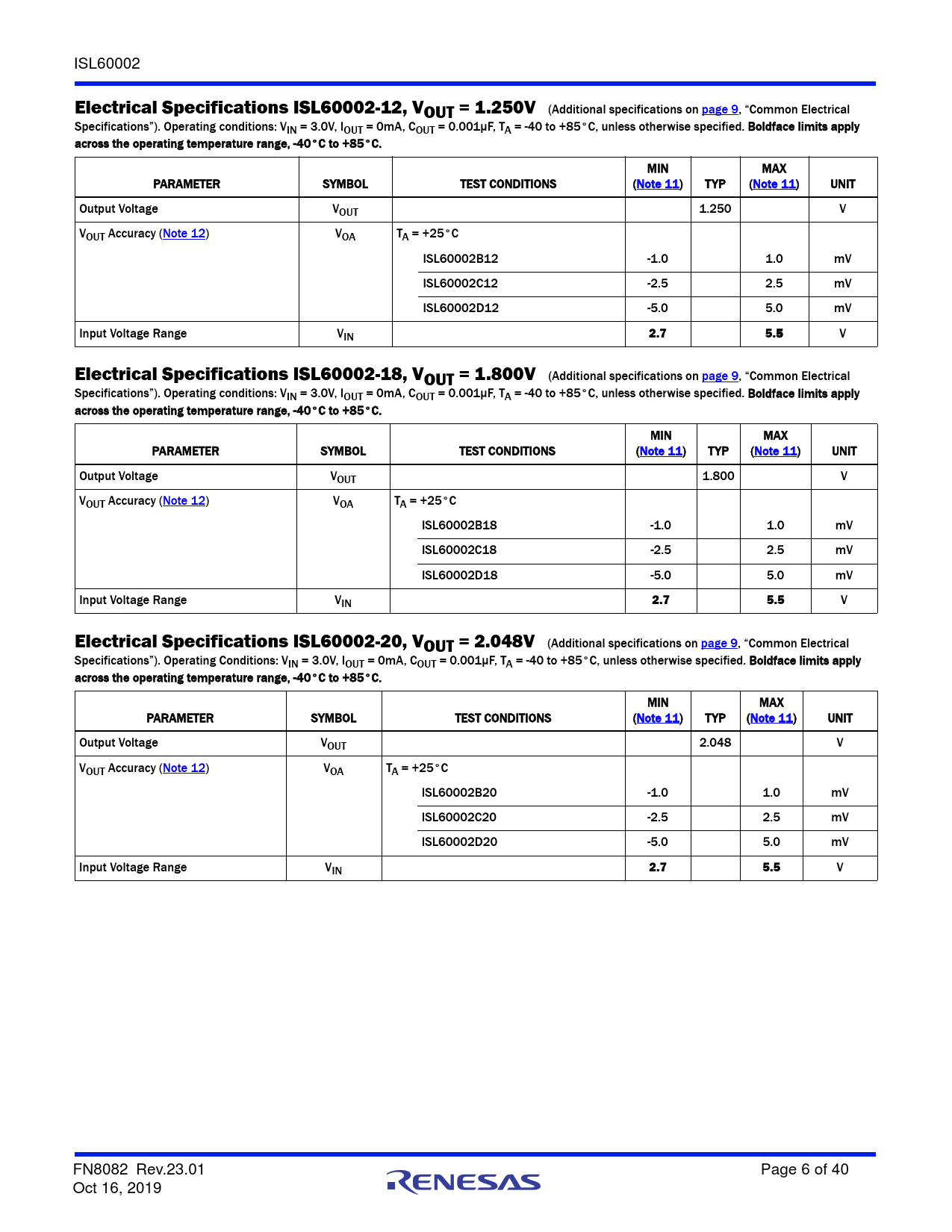 Línea de modelo para esta hoja de datos Versión de texto del documento link to page 9 link to page 9 link to page 9 link to page 9 link to page 9 link to page 9 link to page 9 link to page 9 link to page 9 link to page 9 link to page 9 link to page 9 ISL60002 Electrical Specifications ISL60002-12, VOUT = 1.250V (Additional specifications on page 9, “Common Electrical Specifications”). Operating conditions: VIN = 3.0V, IOUT = 0mA, COUT = 0.001µF, TA = -40 to +85°C, unless otherwise specified. Boldface limits apply across the operating temperature range, -40°C to +85°C. MIN MAX PARAMETER SYMBOL TEST CONDITIONS (Note 11) TYP (Note 11) UNIT Output Voltage VOUT 1.250 V VOUT Accuracy (Note 12) VOA TA = +25°C ISL60002B12 -1.0 1.0 mV ISL60002C12 -2.5 2.5 mV ISL60002D12 -5.0 5.0 mV Input Voltage Range VIN 2.7 5.5 V Electrical Specifications ISL60002-18, VOUT = 1.800V (Additional specifications on page 9, “Common Electrical Specifications”). Operating conditions: VIN = 3.0V, IOUT = 0mA, COUT = 0.001µF, TA = -40 to +85°C, unless otherwise specified. Boldface limits apply across the operating temperature range, -40°C to +85°C. MIN MAX PARAMETER SYMBOL TEST CONDITIONS (Note 11) TYP (Note 11) UNIT Output Voltage VOUT 1.800 V VOUT Accuracy (Note 12) VOA TA = +25°C ISL60002B18 -1.0 1.0 mV ISL60002C18 -2.5 2.5 mV ISL60002D18 -5.0 5.0 mV Input Voltage Range VIN 2.7 5.5 V Electrical Specifications ISL60002-20, VOUT = 2.048V (Additional specifications on page 9, “Common Electrical Specifications”). Operating Conditions: VIN = 3.0V, IOUT = 0mA, COUT = 0.001µF, TA = -40 to +85°C, unless otherwise specified. Boldface limits apply across the operating temperature range, -40°C to +85°C. MIN MAX PARAMETER SYMBOL TEST CONDITIONS (Note 11) TYP (Note 11) UNIT Output Voltage VOUT 2.048 V VOUT Accuracy (Note 12) VOA TA = +25°C ISL60002B20 -1.0 1.0 mV ISL60002C20 -2.5 2.5 mV ISL60002D20 -5.0 5.0 mV Input Voltage Range VIN 2.7 5.5 V FN8082 Rev.23.01 Page 6 of 40 Oct 16, 2019 Document Outline Applications Features Related Literature Table of Contents Pin Configuration Pin Descriptions Ordering Information Absolute Maximum Ratings Thermal Information Environmental Operating Conditions Recommended Operating Conditions Electrical Specifications ISL60002-10, VOUT = 1.024V Electrical Specifications ISL60002-11, VOUT = 1.200V Electrical Specifications ISL60002-12, VOUT = 1.250V Electrical Specifications ISL60002-18, VOUT = 1.800V Electrical Specifications ISL60002-20, VOUT = 2.048V Electrical Specifications ISL60002-25, VOUT = 2.500V Electrical Specifications ISL60002-26, VOUT = 2.600V Electrical Specifications ISL60002-30, VOUT = 3.000V Electrical Specifications ISL60002-33, VOUT = 3.300V Common Electrical Specifications ISL60002 -10, -11, -12, -18, -20, and -25 Typical Performance Characteristic Curves, VOUT = 1.024V Typical Performance Characteristic Curves, VOUT = 1.20V Typical Performance Characteristic Curves, VOUT = 1.25V Typical Performance Curves, VOUT = 1.8V Typical Performance Curves, VOUT = 2.048V Typical Performance Characteristic Curves, VOUT = 2.50V Typical Performance Characteristic Curves, VOUT = 3.0V Typical Performance Characteristic Curves, VOUT = 3.3V High Current Application Applications Information FGA Technology Nanopower Operation Board Mounting Considerations Board Assembly Considerations Special Applications Considerations Noise Performance and Reduction Turn-On Time Temperature Coefficient Typical Application Circuits Revision History Package Outline Drawing