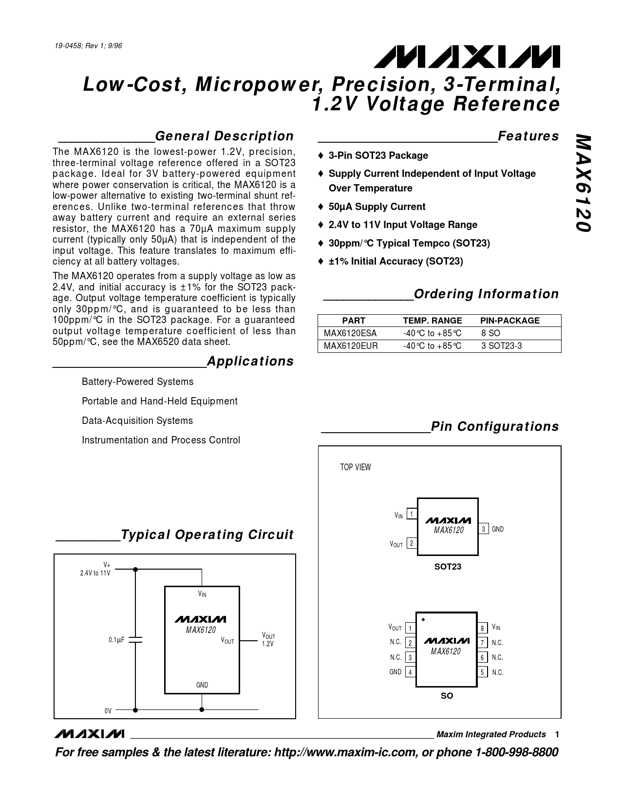 19-0458; Rev 1; 9/96 Low-Cost, Micropower, Precision, 3-Terminal,1.2V Voltage ReferenceMAX6120_______________General Description____________________________Features The MAX6120 is the lowest-power 1.2V, precision, ♦ 3-Pin SOT23 Package three-terminal voltage reference offered in a SOT23 package. Ideal for 3V battery-powered equipment ♦ Supply Current Independent of Input Voltage where power conservation is critical, the MAX6120 is a Over Temperature low-power alternative to existing two-terminal shunt ref- erences. Unlike two-terminal references that throw ♦ 50µA Supply Current away battery current and require an external series resistor, the MAX6120 has a 70µA maximum supply ♦ 2.4V to 11V Input Voltage Range current (typically only 50µA) that is independent of the ♦ 30ppm/°C Typical Tempco (SOT23) input voltage. This feature translates to maximum effi- ciency at all battery voltages. ♦ ±1% Initial Accuracy (SOT23) The MAX6120 operates from a supply voltage as low as 2.4V, and initial accuracy is ±1% for the SOT23 pack- age. Output voltage temperature coefficient is typically ______________Ordering Information only 30ppm/°C, and is guaranteed to be less than 100ppm/°C in the SOT23 package. For a guaranteed PARTTEMP. RANGEPIN-PACKAGE output voltage temperature coefficient of less than MAX6120ESA -40°C to +85°C 8 SO 50ppm/°C, see the MAX6520 data sheet. MAX6120EUR -40°C to +85°C 3 SOT23-3 ________________________Applications Battery-Powered Systems Portable and Hand-Held Equipment Data-Acquisition Systems _________________Pin Configurations Instrumentation and Process Control TOP VIEW V 1 IN 3 GND MAX6120 __________Typical Operating Circuit V 2 OUT V+ SOT23 2.4V to 11V VIN VOUT 1 8 VIN MAX6120 V 0.1µF V OUT OUT N.C. 1.2V 2 7 N.C. MAX6120 N.C. 3 6 N.C. GND 4 5 N.C. GND SO 0V ________________________________________________________________ Maxim Integrated Products1For free samples & the latest literature: http://www.maxim-ic.com, or phone 1-800-998-8800